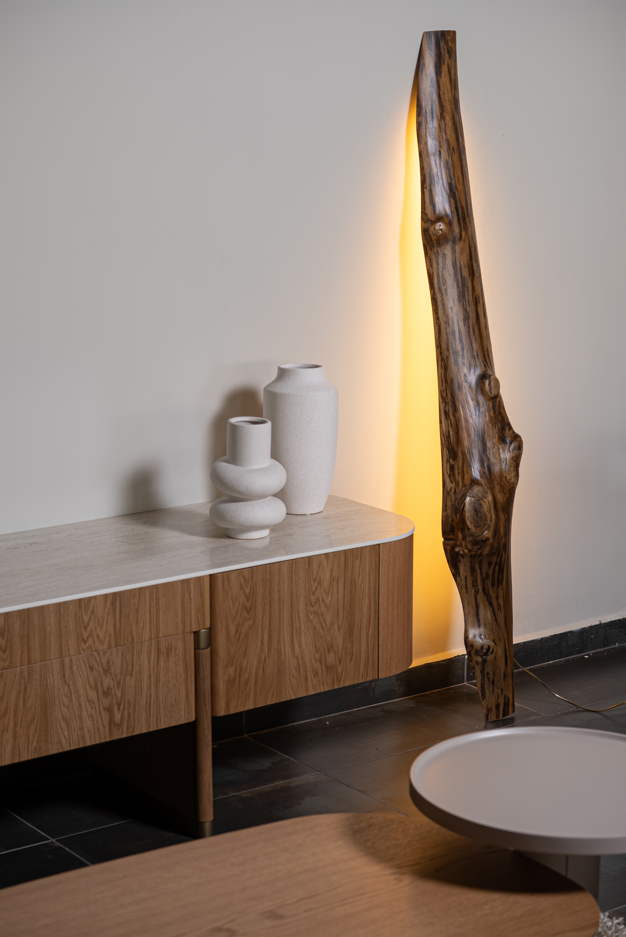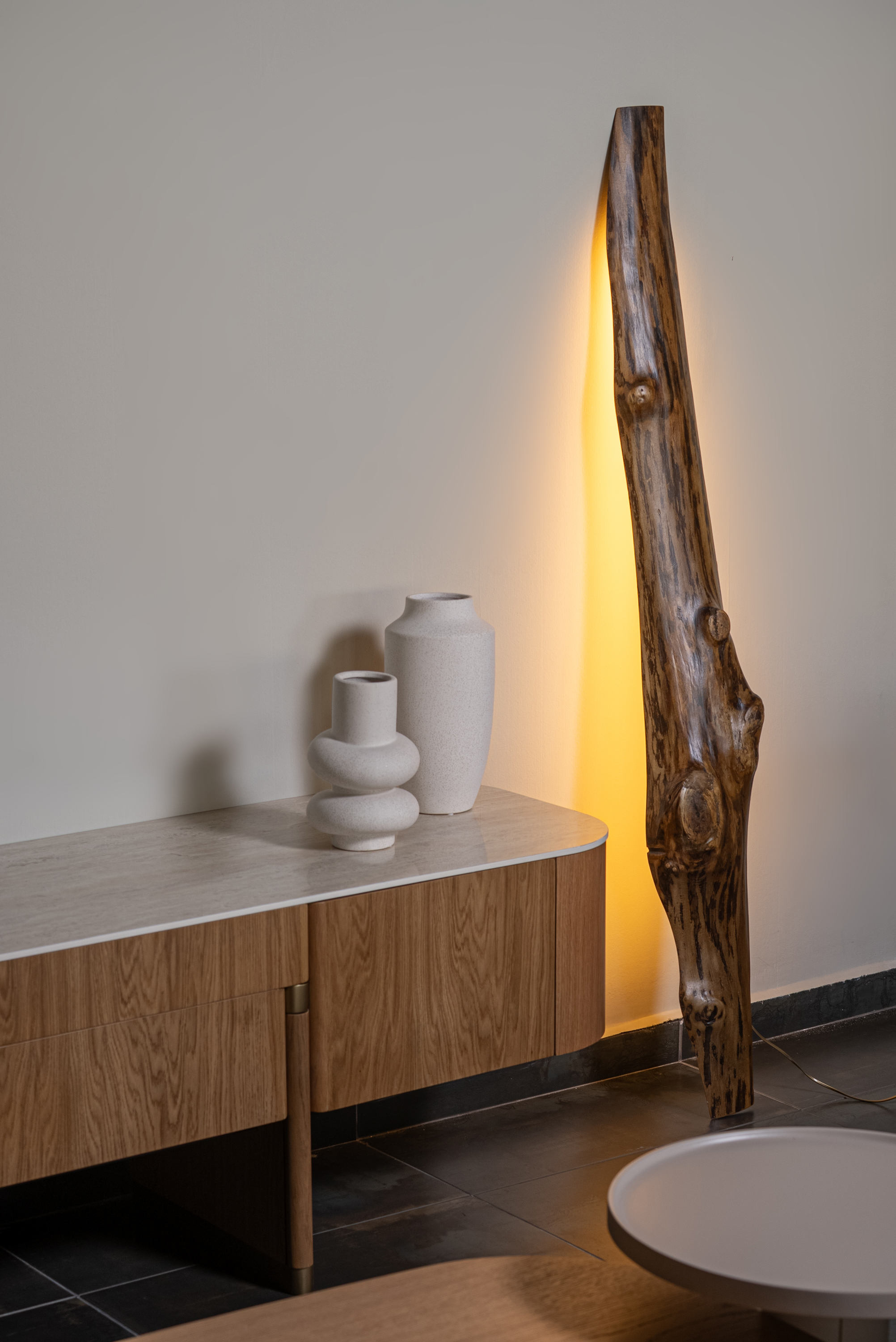 Το Επιδαπέδιο Φωτιστικό Masif light 01 αποτελεί ένα μοναδικό διακοσμητικό και λειτουργικό στοιχείο φωτισμού, κατασκευασμένο από αυθεντικό κομμάτι μασίφ ξύλου. Η φυσική μορφή του κορμού διατηρείται αναλλοίωτη, αναδεικνύοντας τα νερά, τους ρόζους και τις οργανικές καμπύλες που δημιουργεί ο χρόνος στη δομή του ξύλου. Κάθε φωτιστικό είναι απολύτως μοναδικό, καθώς προέρχεται από διαφορετική επιλογή φυσικού κορμού.