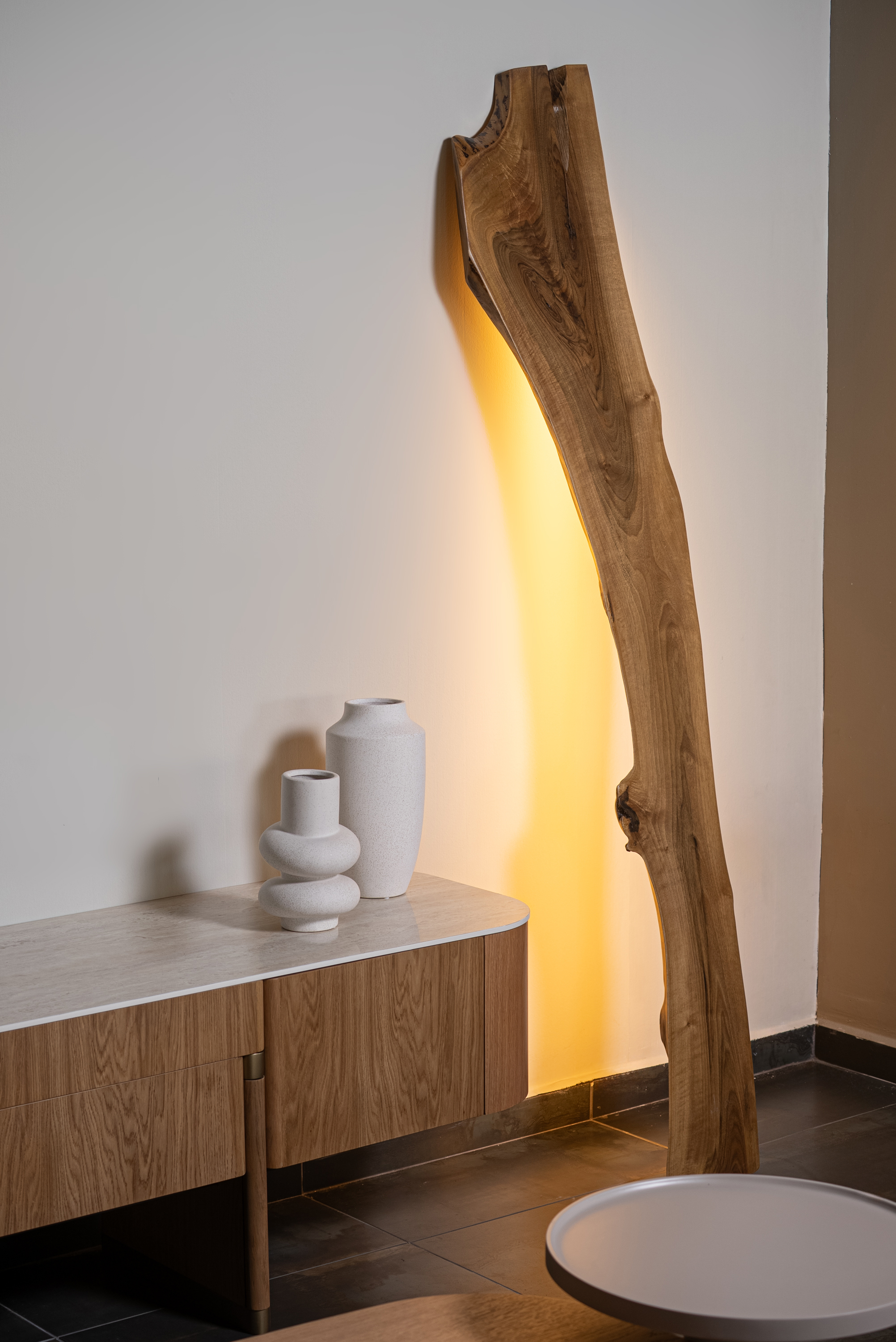 Το Επιδαπέδιο Φωτιστικό Masif light 03 αποτελεί ένα μοναδικό αντικείμενο design που συνδυάζει την ακατέργαστη ομορφιά του φυσικού ξύλου με τη σύγχρονη τεχνολογία φωτισμού. Κατασκευασμένο από μονοκόμματο κορμό μασίφ ξύλου, διατηρεί τις αυθεντικές καμπύλες, τα νερά και τις φυσικές ατέλειες που το καθιστούν απόλυτα μοναδικό.