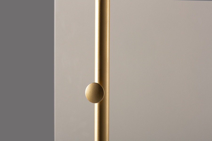 Η κατασκευή του βασίζεται σε έναν στιβαρό μεταλλικό σκελετό με πολυτελές φινίρισμα, ο οποίος προσφέρει εξαιρετική σταθερότητα και αντοχή στον χρόνο. Οι απαλές, καμπύλες γραμμές του πλαισίου προσδίδουν μια αίσθηση ηρεμίας, ενώ ο ολόσωμος κρύσταλλος εξασφαλίζει καθαρή είδωλο χωρίς παραμορφώσεις. Η χρυσή βάση προσθέτει μια διακριτική νότα πολυτέλειας, καθιστώντας τον ιδανικό για minimal ή contemporary διακοσμήσεις.