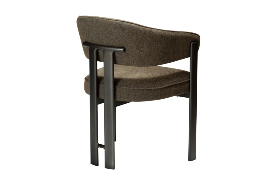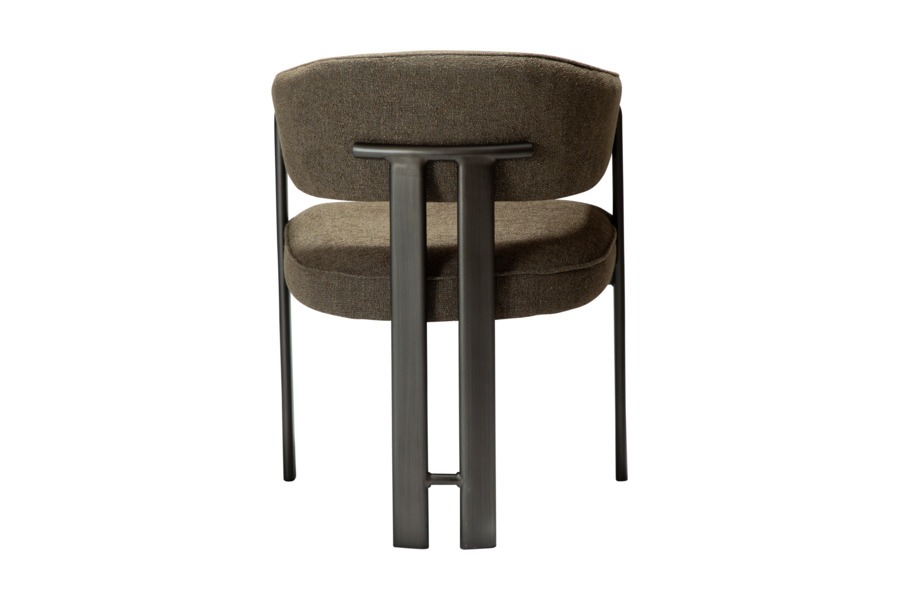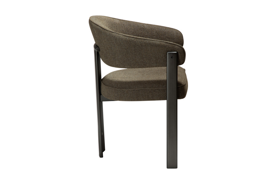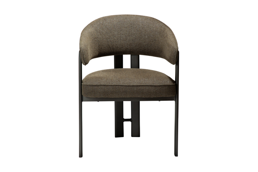 Η επένδυση από bouclé ύφασμα σε βαθιά απόχρωση dark olive προσθέτει χαρακτήρα και βάθος στον χώρο, ενώ το πλούσιο κάθισμα ενισχύει την αίσθηση άνεσης. Η μεταλλική βάση εξασφαλίζει σταθερότητα και αντοχή.