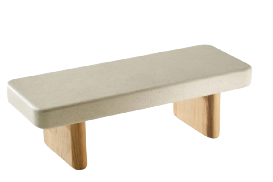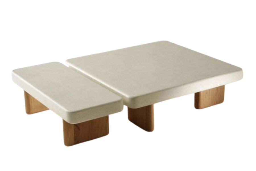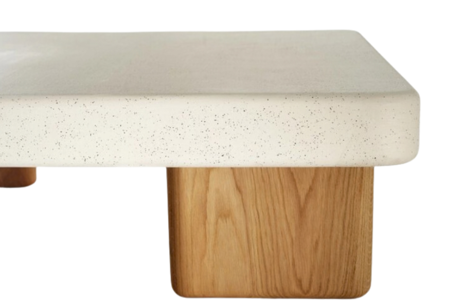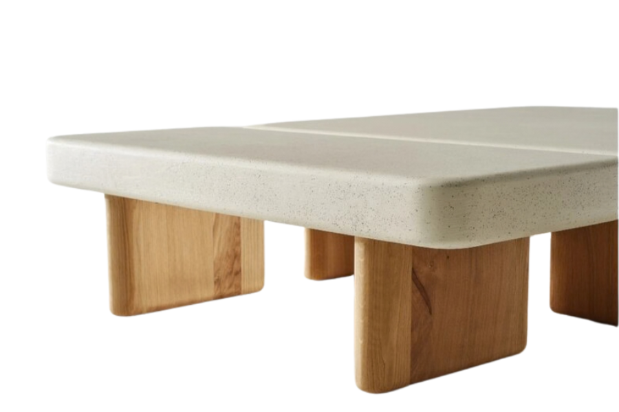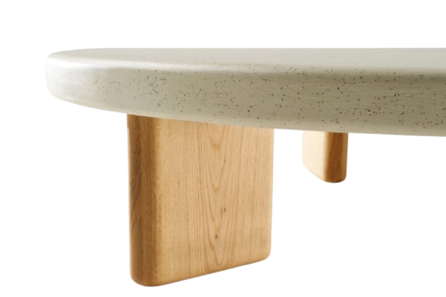 Η βάση αποτελείται από ξύλινα πόδια σε φυσική απόχρωση, δημιουργώντας μια ζεστή αντίθεση με την stone επιφάνεια και ενισχύοντας τον φυσικό χαρακτήρα του επίπλου. Οι καθαρές γραμμές και ο ισορροπημένος σχεδιασμός το καθιστούν ιδανικό για σύγχρονα, minimal και σκανδιναβικά σαλόνια.