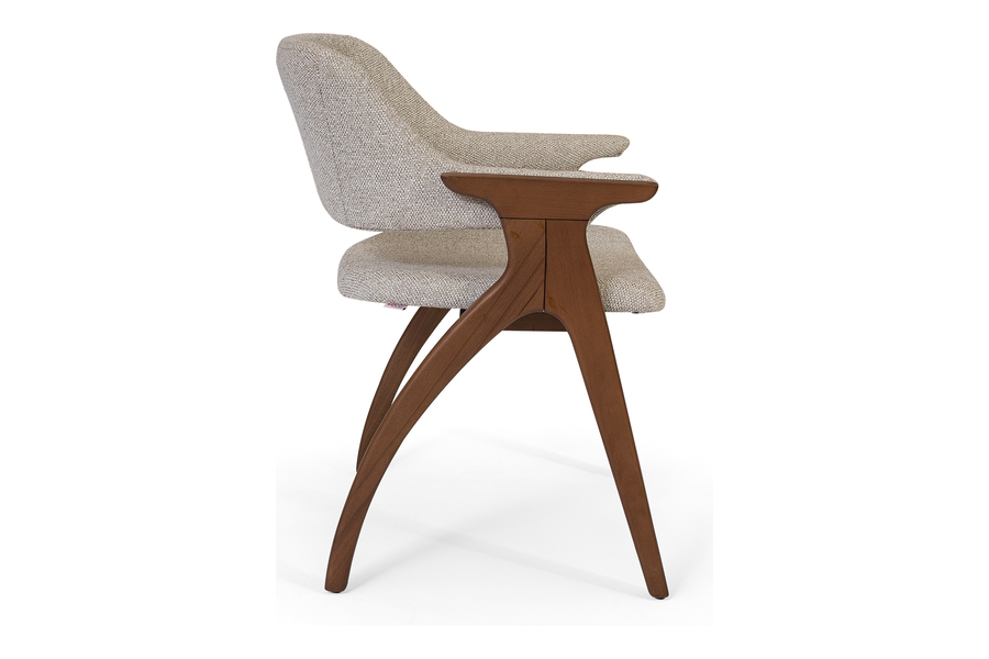 Ο σκελετός της είναι κατασκευασμένος από μασίφ ξύλο υψηλής ποιότητας, με προσεγμένες καμπύλες και σταθερή βάση που εξασφαλίζουν αντοχή και καθημερινή άνεση. Το κάθισμα και η πλάτη επενδύονται με μαλακό, ανθεκτικό ύφασμα, προσφέροντας ευχάριστη αίσθηση και σωστή στήριξη κατά τη χρήση.