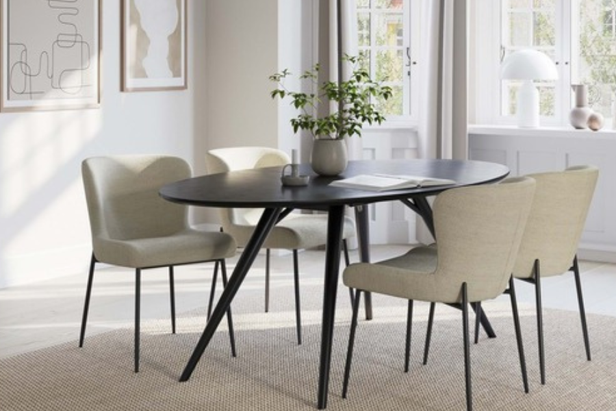 Τα λεπτά, ελαφρώς κωνικά μεταλλικά πόδια σε μαύρο χρώμα προσδίδουν σταθερότητα και κομψότητα, ενώ η προέκτασή τους στην πλάτη δημιουργεί ένα ιδιαίτερο σχεδιαστικό στοιχείο που ενισχύει τη luxury αισθητική.