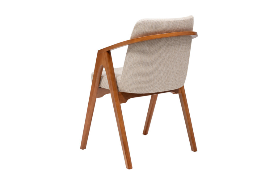 Η Καρέκλα Τραπεζαρίας Doha αποτελεί μια σπουδή στον σύγχρονο σχεδιασμό, συνδυάζοντας την αυστηρή γεωμετρία με την απόλυτη άνεση. Το πλέον χαρακτηριστικό στοιχείο της είναι ο σκελετός από μασίφ ξύλο σε θερμή φυσική απόχρωση, με τα πόδια να σχηματίζουν ένα εντυπωσιακό "Α" που προσφέρει εξαιρετική σταθερότητα και έναν αέρα mid-century πολυτέλειας. Η πλάτη και το κάθισμα είναι ενιαία επενδυμένα με ύφασμα υψηλής ποιότητας σε ανοιχτή μπεζ απόχρωση, το οποίο διαθέτει πυκνή ύφανση για μεγάλη αντοχή στην καθημερινή χρήση. Ο εργονομικός σχεδιασμός της πλάτης, σε συνδυασμό με τα ενσωματωμένα μπράτσα που ακολουθούν την κλίση του σκελετού, εξασφαλίζουν μια αναπαυτική εμπειρία καθίσματος.