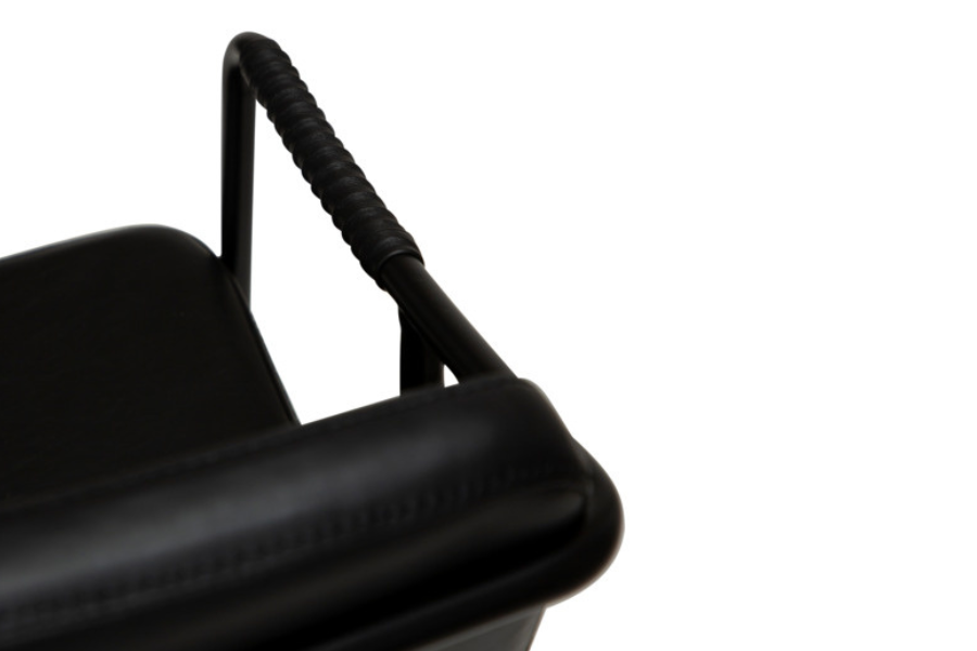 Ιδιαίτερο στοιχείο του σχεδιασμού είναι η επένδυση τεχνητού δέρματος στα μπράτσα, η οποία λειτουργεί ως διακοσμητική λεπτομέρεια και ενισχύει τον χαρακτήρα του μοντέλου. Ο μεταλλικός σκελετός σε μαύρη απόχρωση προσφέρει ανθεκτικότητα και σταθερότητα, ενώ το ενσωματωμένο υποπόδιο εξασφαλίζει επιπλέον άνεση.