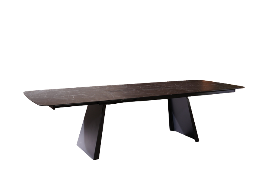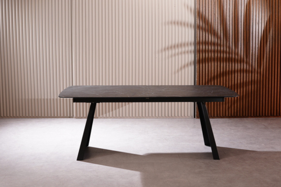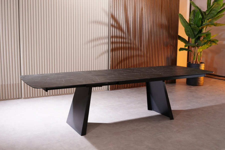 Η επιφάνεια του τραπεζιού είναι κατασκευασμένη από HPL (High Pressure Laminate) σε εντυπωσιακή απόχρωση μαύρου μαρμάρου με λευκά νερά. Το υλικό HPL εξασφαλίζει εξαιρετική αντοχή στις γρατζουνιές, τη θερμότητα και τη φθορά, προσφέροντας την πολυτελή υφή του μαρμάρου με ένα κομψό ματ φινίρισμα. Η βάση του αποτελείται από στιβαρά μεταλλικά πόδια σε μαύρο ματ χρώμα, σχεδιασμένα σε γωνία για να προσφέρουν μέγιστη σταθερότητα και άνεση κινήσεων.