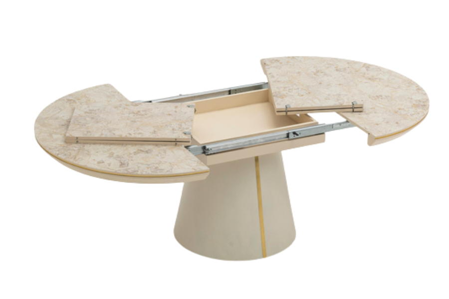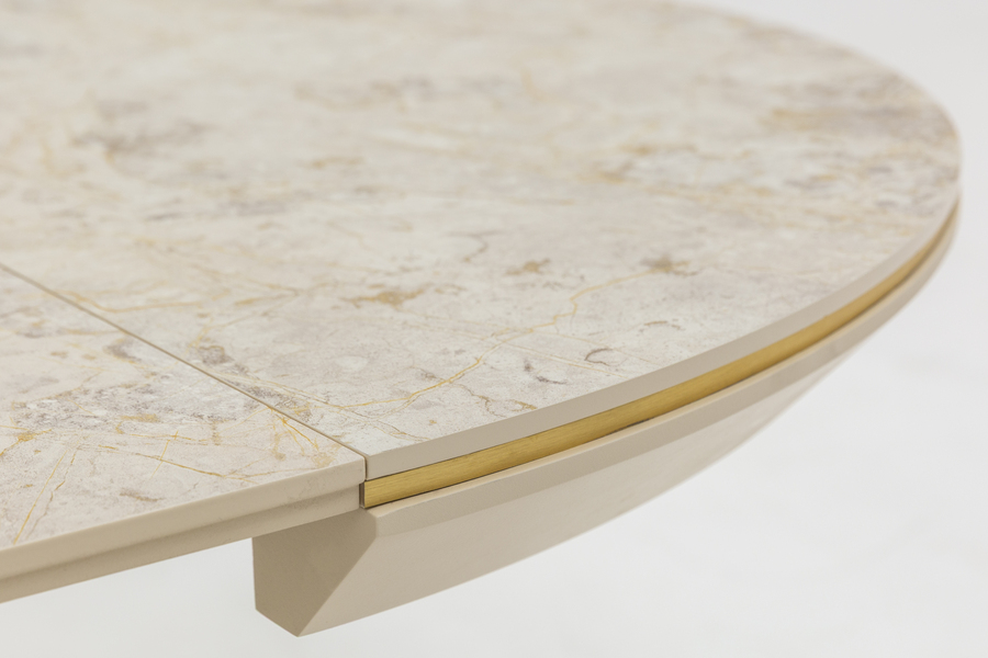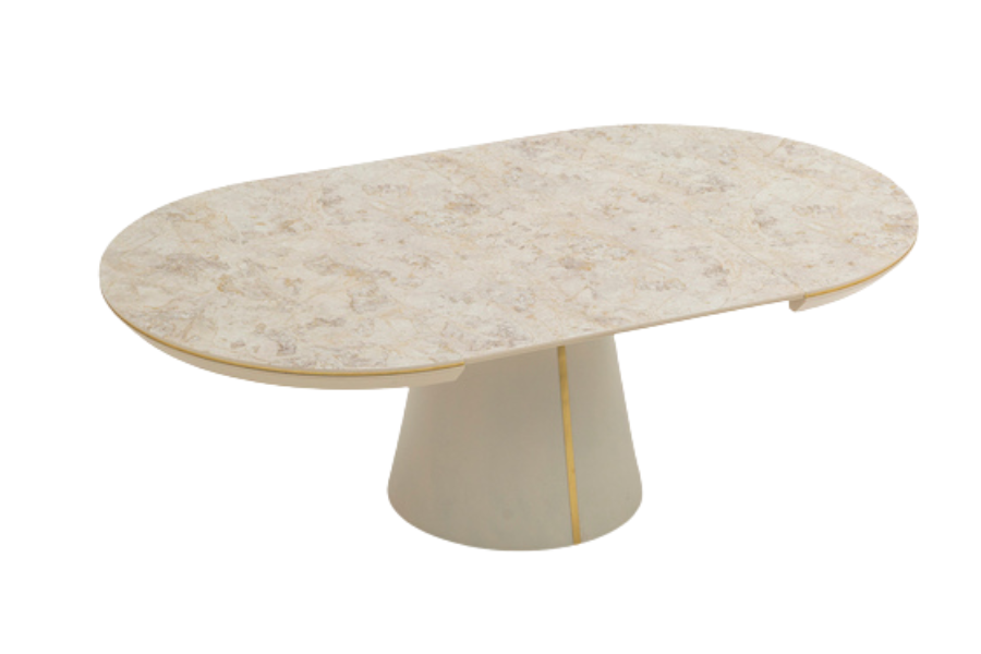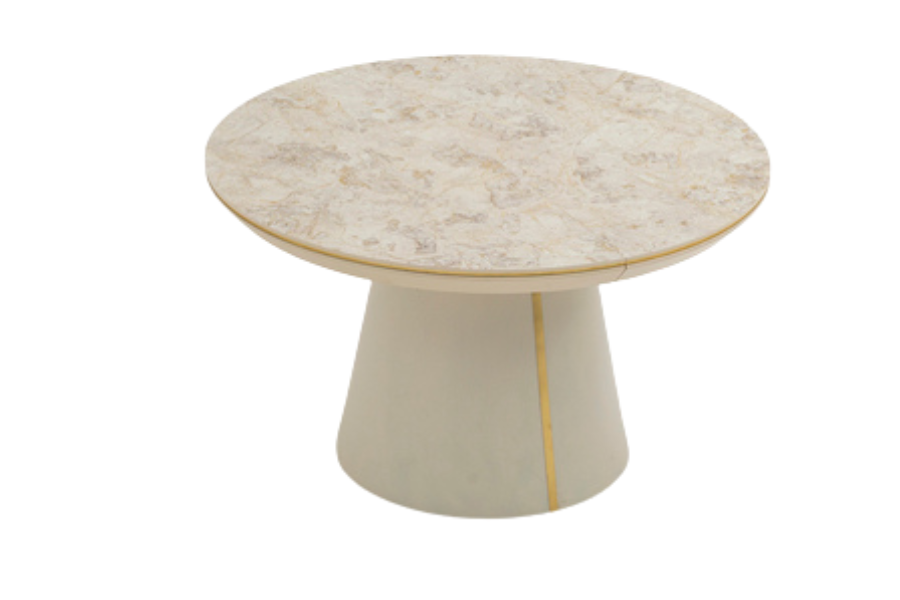 Η επιφάνεια του τραπεζιού είναι κατασκευασμένη από HPL (High Pressure Laminate) σε ανοιχτόχρωμη πέτρινη όψη, προσφέροντας μια φυσική υφή που είναι ταυτόχρονα εξαιρετικά ανθεκτική. Το υλικό HPL εξασφαλίζει μέγιστη προστασία από γρατζουνιές, θερμότητα και καθημερινή φθορά, διατηρώντας την αισθητική του αρμονία αναλλοίωτη. Η επιβλητική κωνική βάση σε γήινους τόνους διαθέτει μια διακριτική χρυσή λεπτομέρεια που προσθέτει μια νότα πολυτέλειας, εξασφαλίζοντας παράλληλα απόλυτη σταθερότητα.