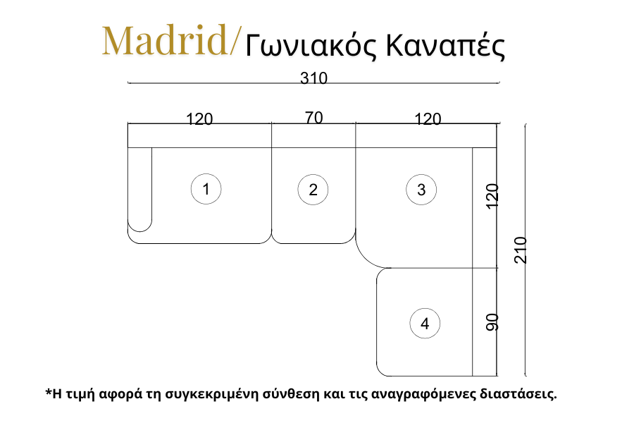 Η τιμή αφορά σύνθεση γωνιακού καναπέ διαστάσεων 310 × 210 cm και περιλαμβάνει τα παρακάτω τμήματα (όπως απεικονίζονται στο σχέδιο):