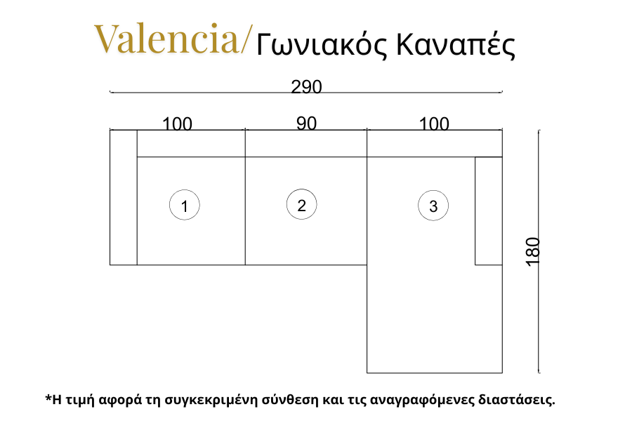 Η τιμή αφορά σύνθεση γωνιακού καναπέ διαστάσεων 290 × 180 cm και περιλαμβάνει τα παρακάτω τμήματα (όπως απεικονίζονται στο σχέδιο):