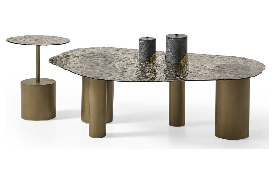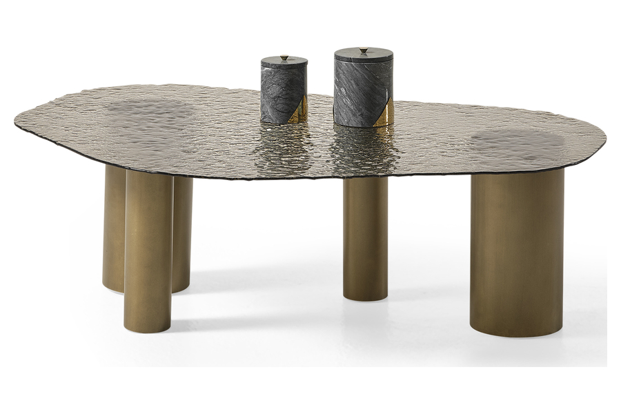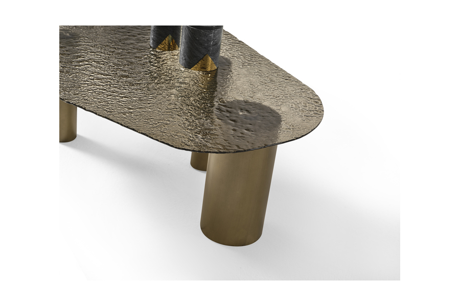 Η βάση αποτελείται από μεταλλικά κυλινδρικά στοιχεία με φινίρισμα σε ζεστούς τόνους, προσφέροντας εξαιρετική σταθερότητα και ταυτόχρονα έντονο αρχιτεκτονικό ενδιαφέρον. Ο συνδυασμός γυαλιού και μετάλλου δημιουργεί ένα κομψό και σύγχρονο αποτέλεσμα.