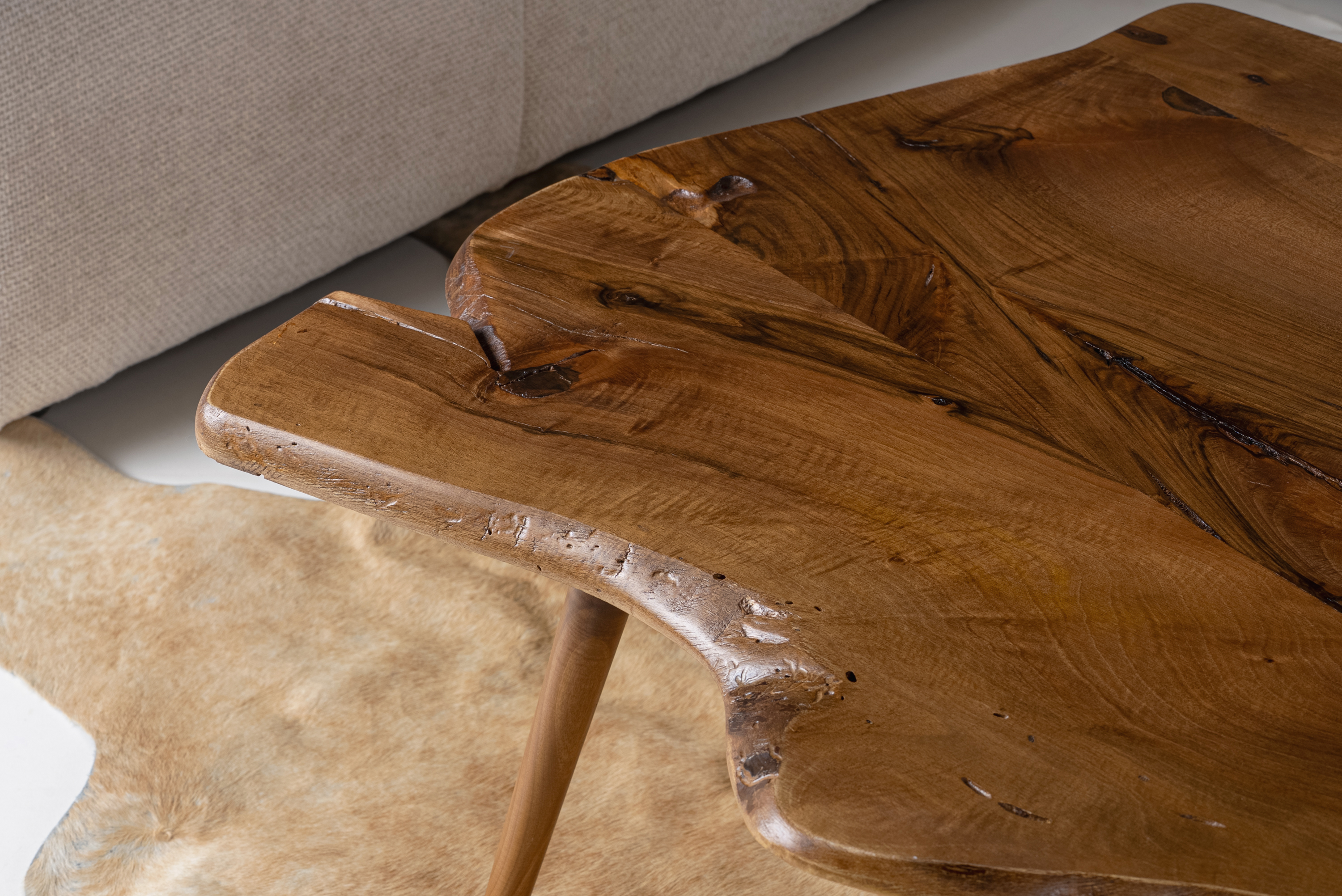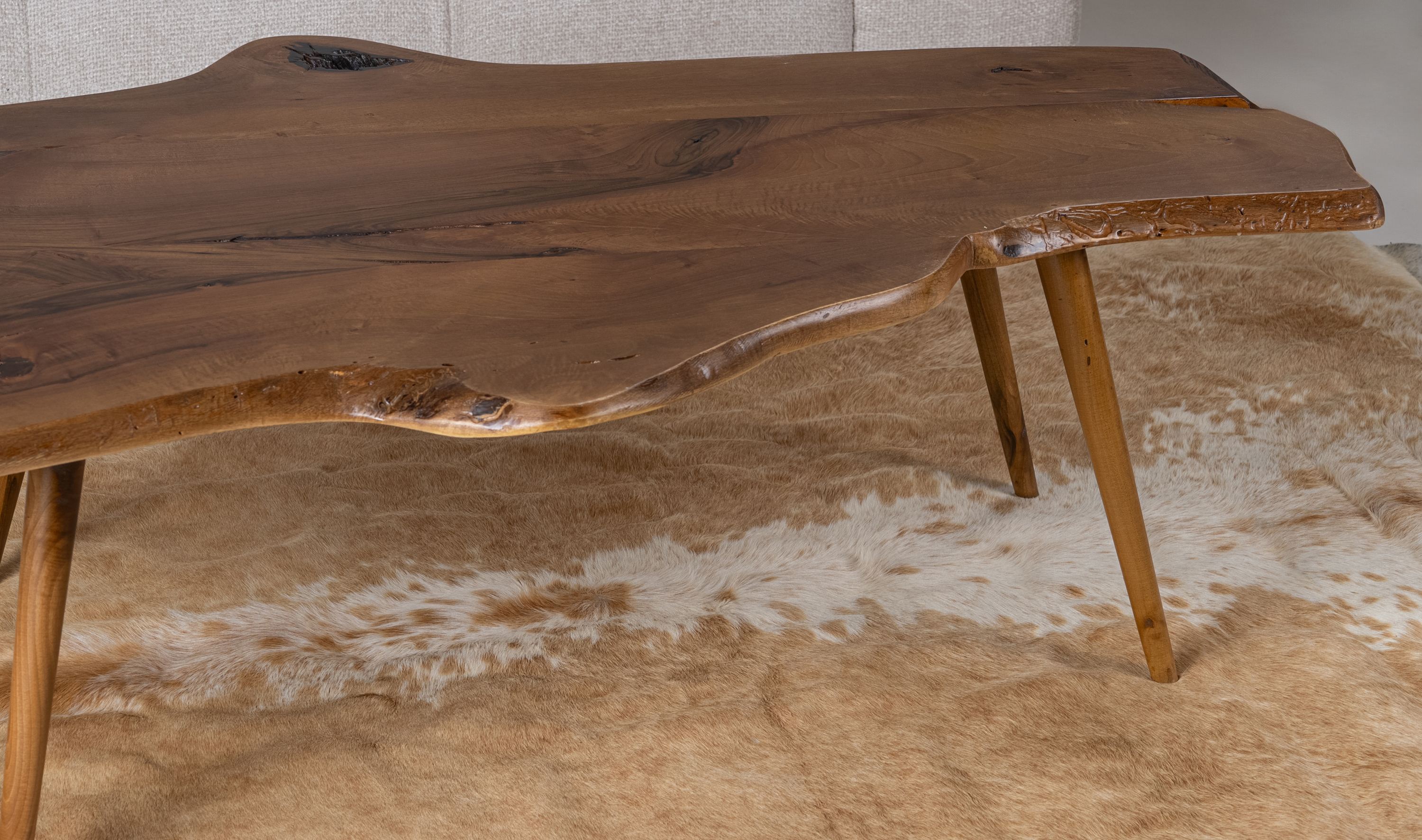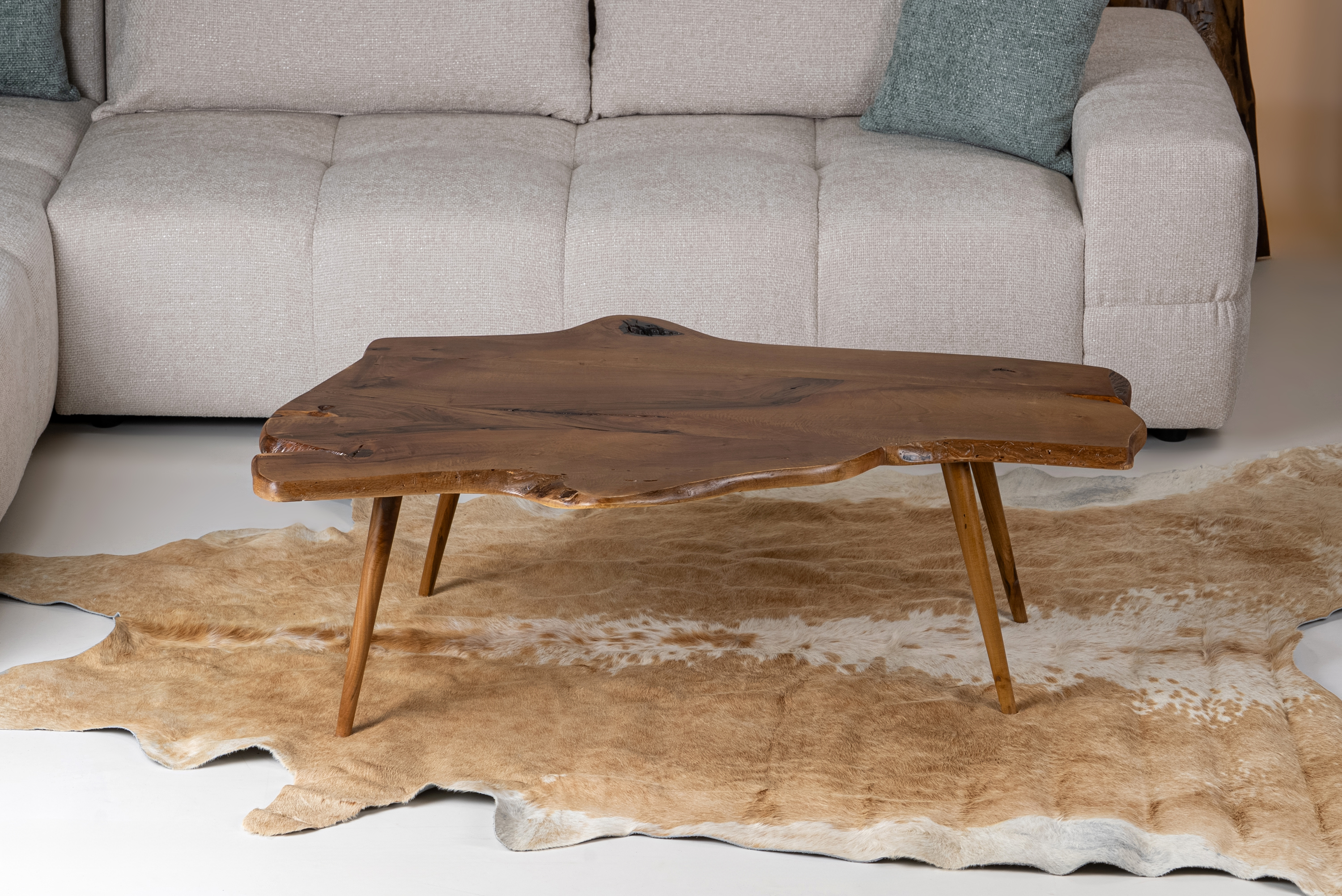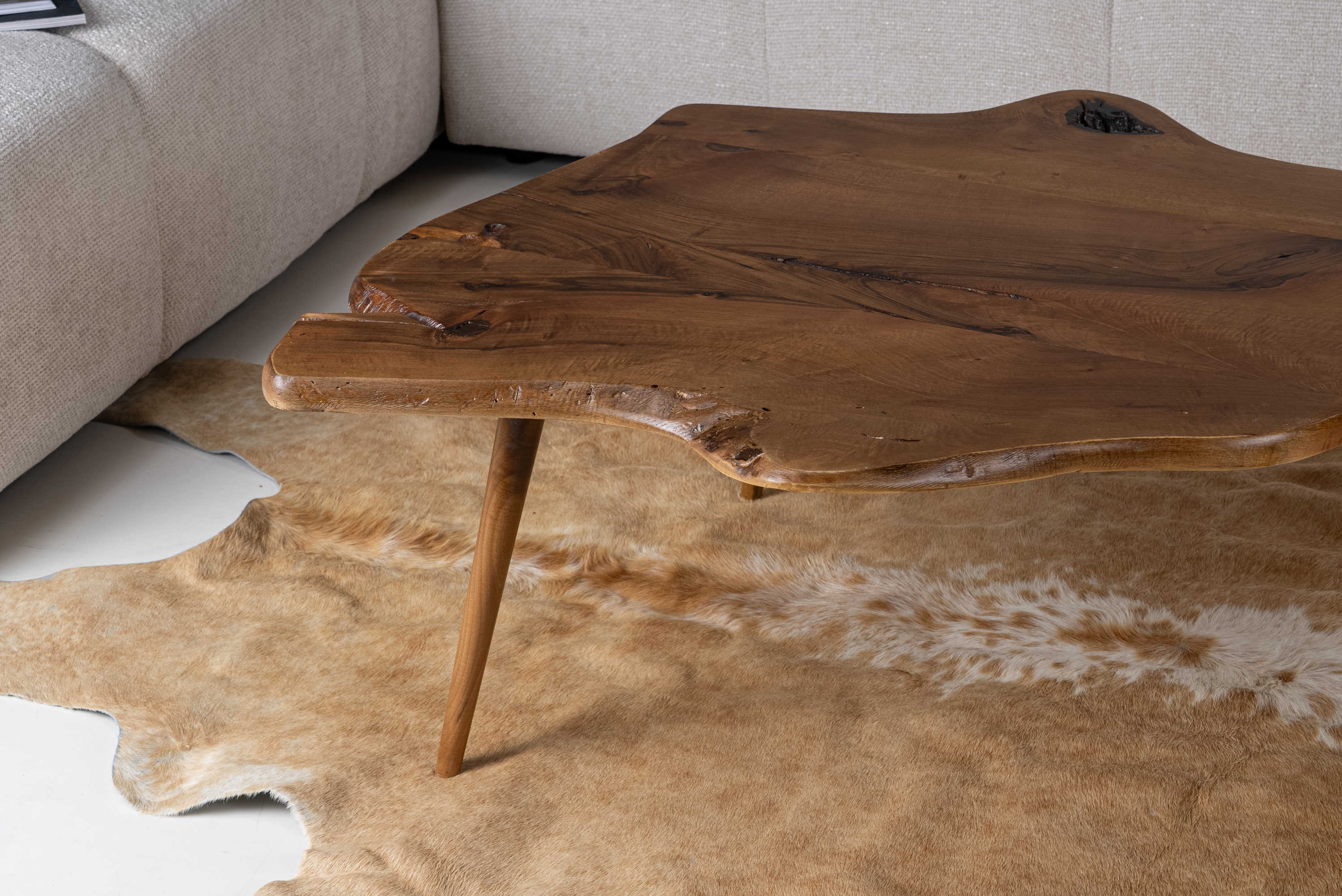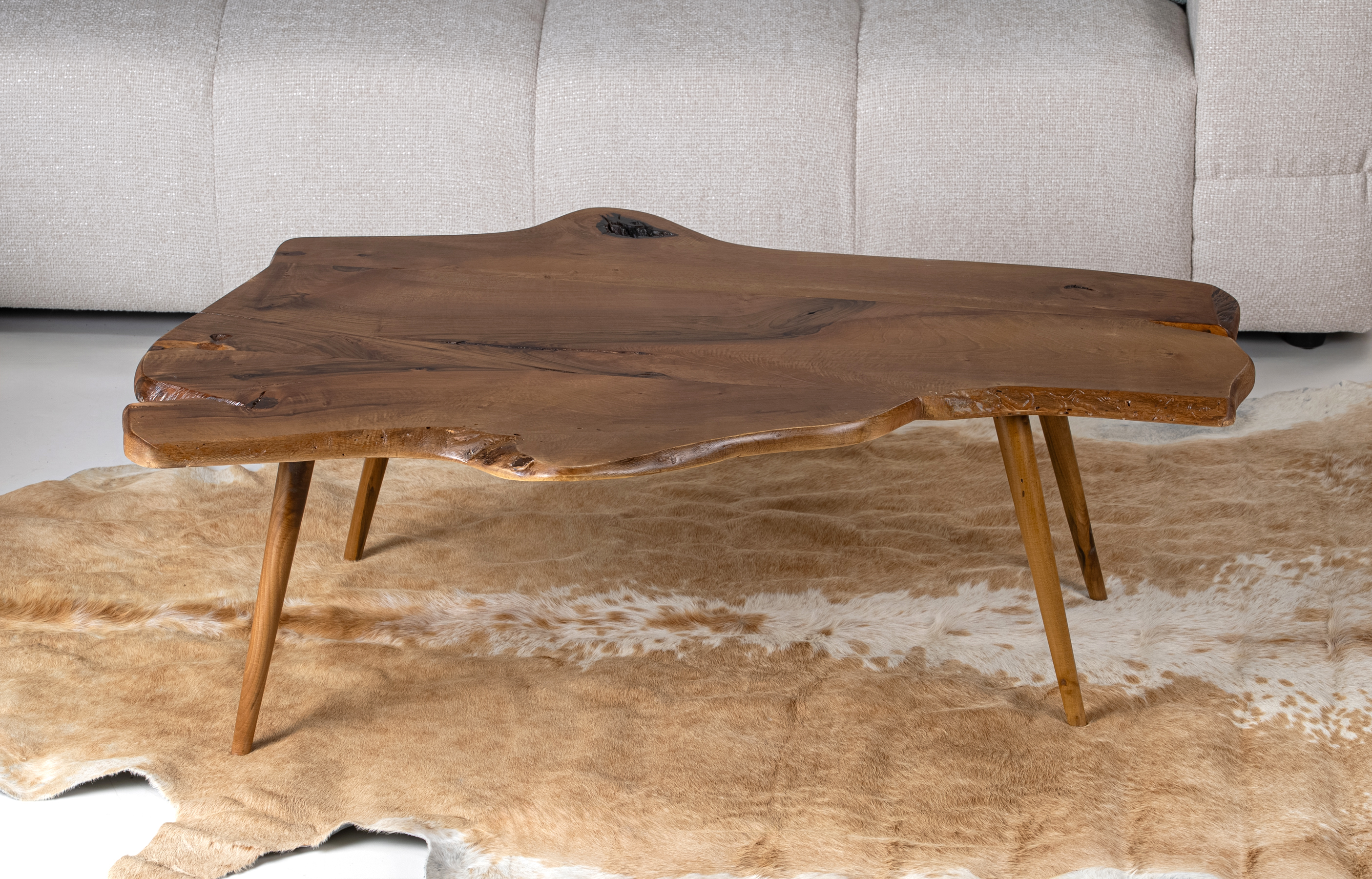 Το τραπεζάκι σαλονιού Masif walnut 05 αποτελεί ένα μοναδικό έπιπλο από 100% μασίφ ξύλο καρυδιάς, σχεδιασμένο για να αναδεικνύει τη φυσική ομορφιά του ξύλου. Η επιφάνειά του διατηρεί το αυθεντικό οργανικό σχήμα του κορμού, με εμφανή νερά, ρόζους και φυσικές ατέλειες που προσδίδουν χαρακτήρα και αυθεντικότητα.