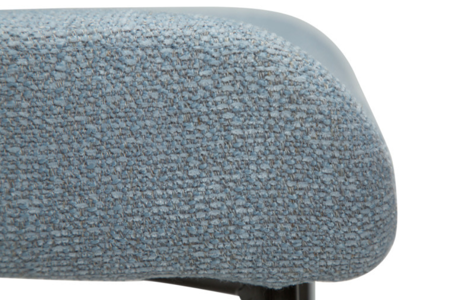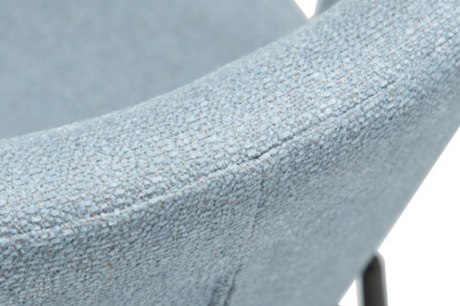 Η επένδυση από bouclé ύφασμα σε blue fog απόχρωση – ένα απαλό, γκριζομπλέ tone – δημιουργεί μία αίσθηση χαλάρωσης και διακριτικής πολυτέλειας. Το χρώμα αυτό λειτουργεί εξαιρετικά σε neutral παλέτες και φωτεινά interiors, προσθέτοντας βάθος χωρίς ένταση.