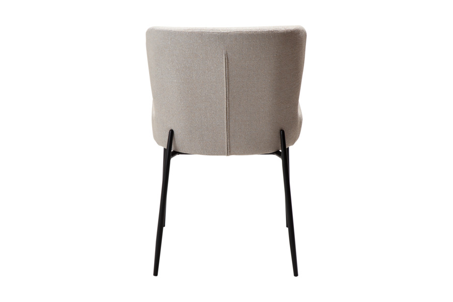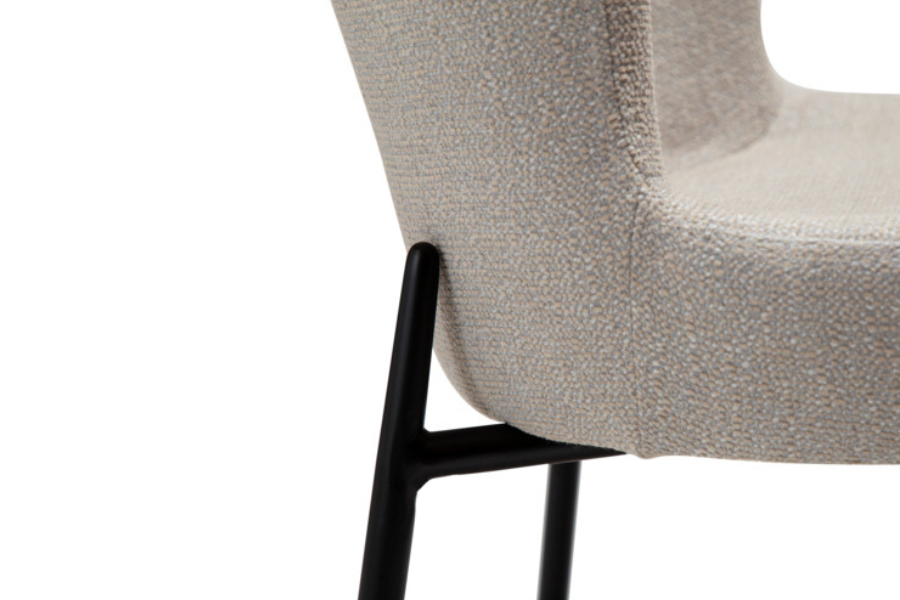 Τα λεπτά, ελαφρώς κωνικά μεταλλικά πόδια σε μαύρο χρώμα δημιουργούν μία κομψή αντίθεση, ενώ η χαρακτηριστική προέκτασή τους στην πλάτη ενισχύει τον premium χαρακτήρα της καρέκλας.