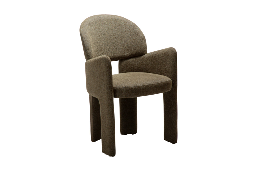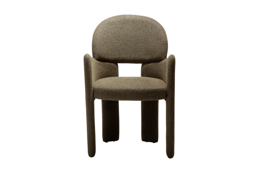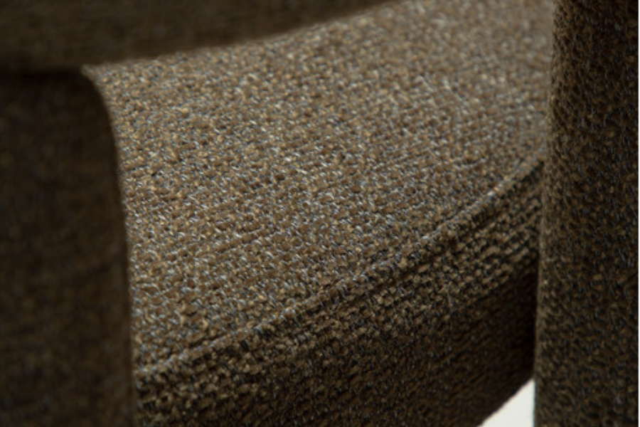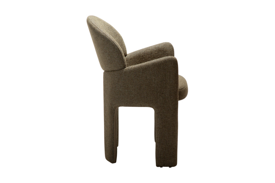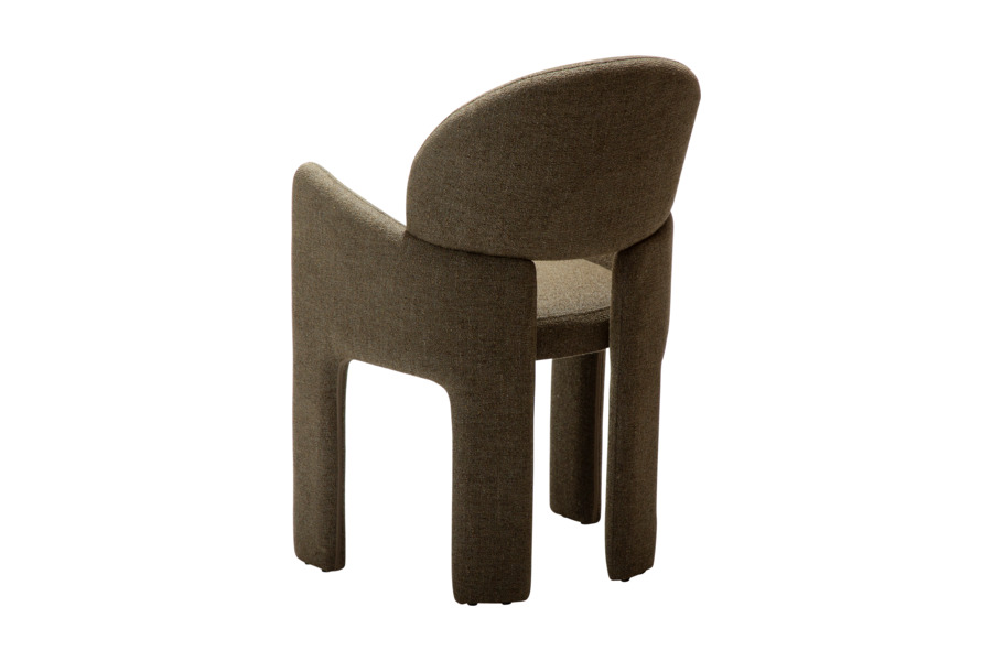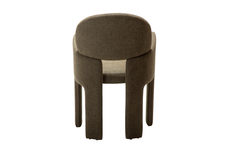 Ο γλυπτικός σχεδιασμός της χαρακτηρίζεται από απαλές καμπύλες και αρμονικές γραμμές που αγκαλιάζουν το σώμα, προσφέροντας άνεση και σωστή εργονομική στήριξη. Η καρέκλα είναι πλήρως επενδυμένη με υφασμάτινη επένδυση υψηλής ποιότητας, η οποία καλύπτει ολόκληρη την κατασκευή από επάνω έως κάτω, ενισχύοντας τη minimal αισθητική και την αίσθηση πολυτέλειας.