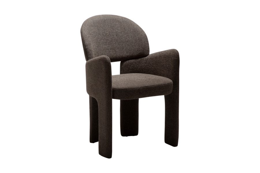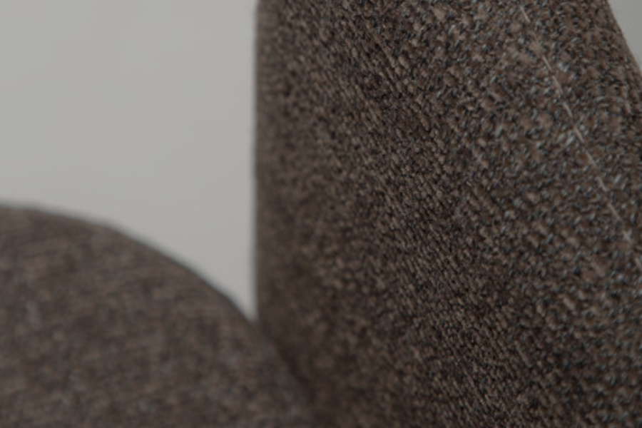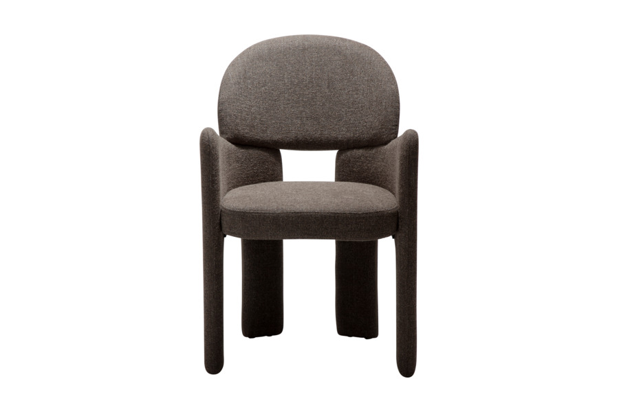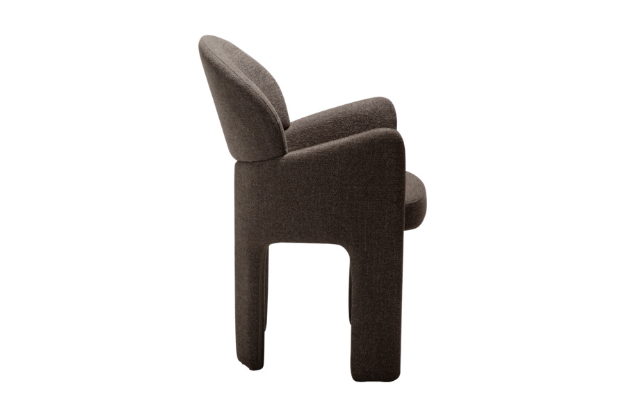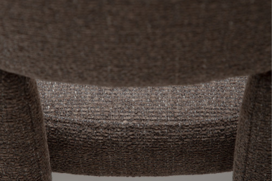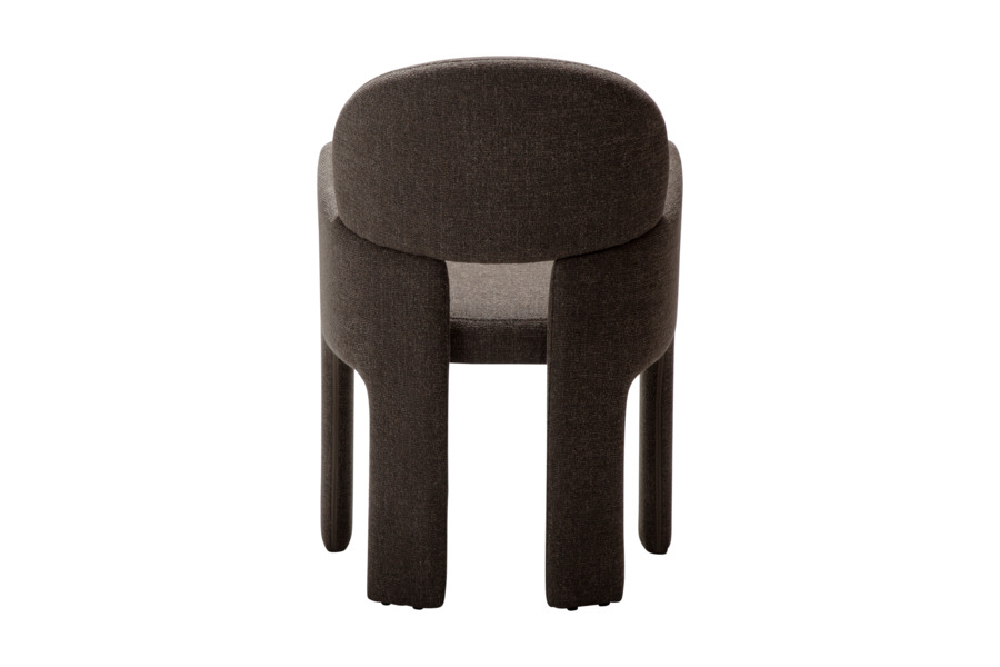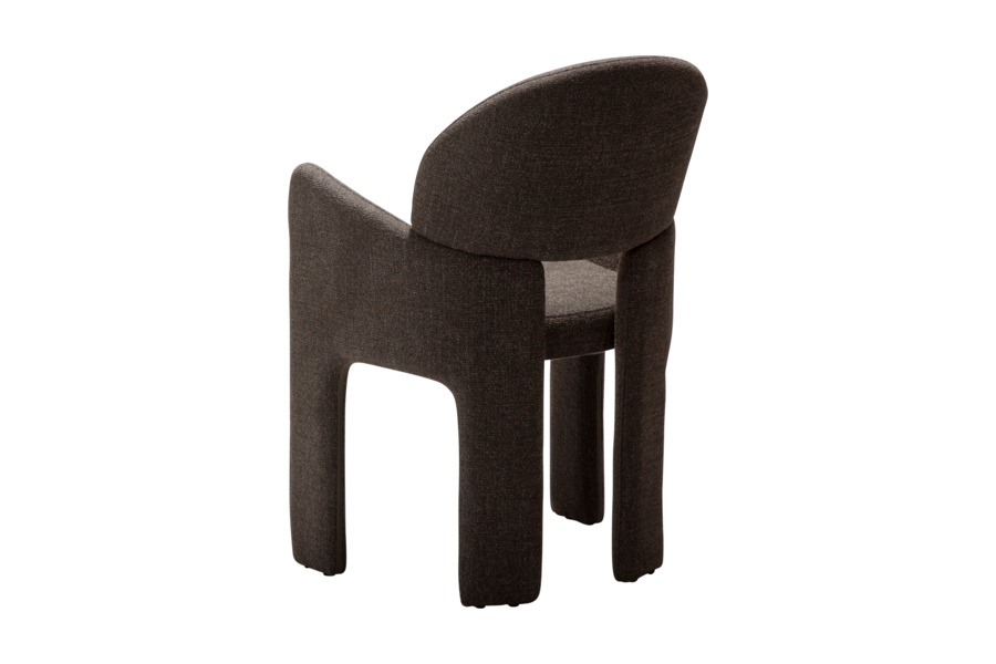 Ο γλυπτικός σχεδιασμός της χαρακτηρίζεται από απαλές καμπύλες και αρμονικές γραμμές που προσφέρουν εργονομική στήριξη και άνετο κάθισμα. Η καρέκλα είναι πλήρως επενδυμένη με υφασμάτινη επένδυση υψηλής ποιότητας, η οποία καλύπτει ολόκληρη την κατασκευή από επάνω έως κάτω, δημιουργώντας μια ενιαία και εκλεπτυσμένη αισθητική.