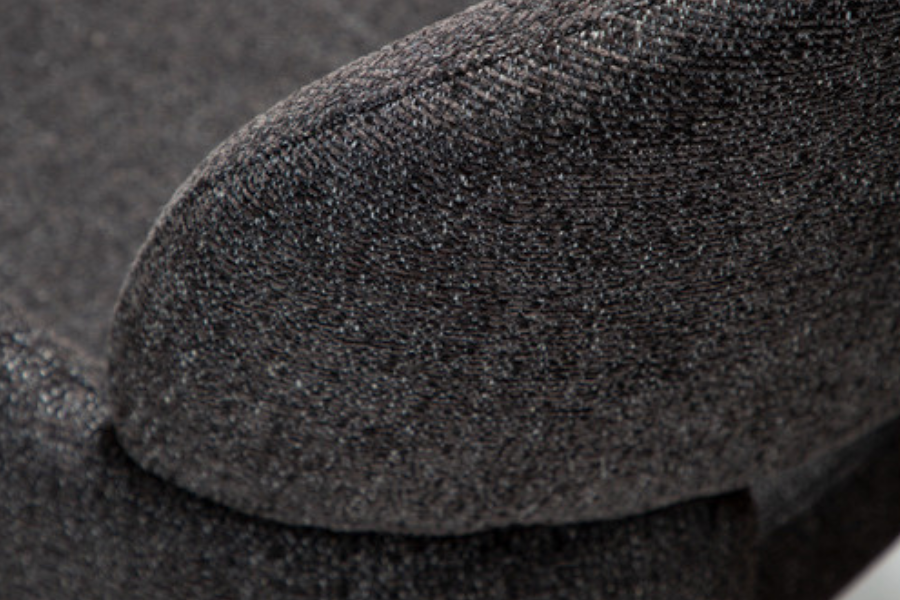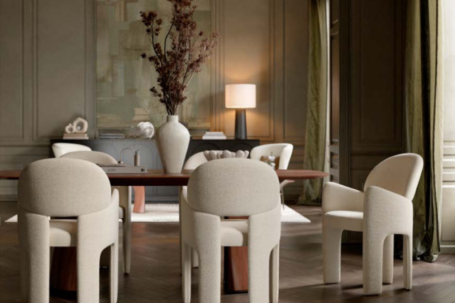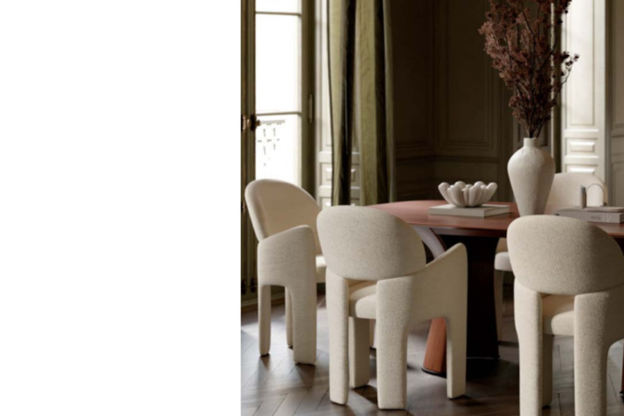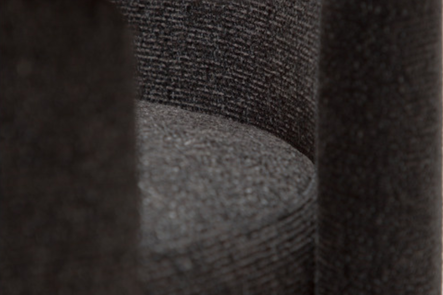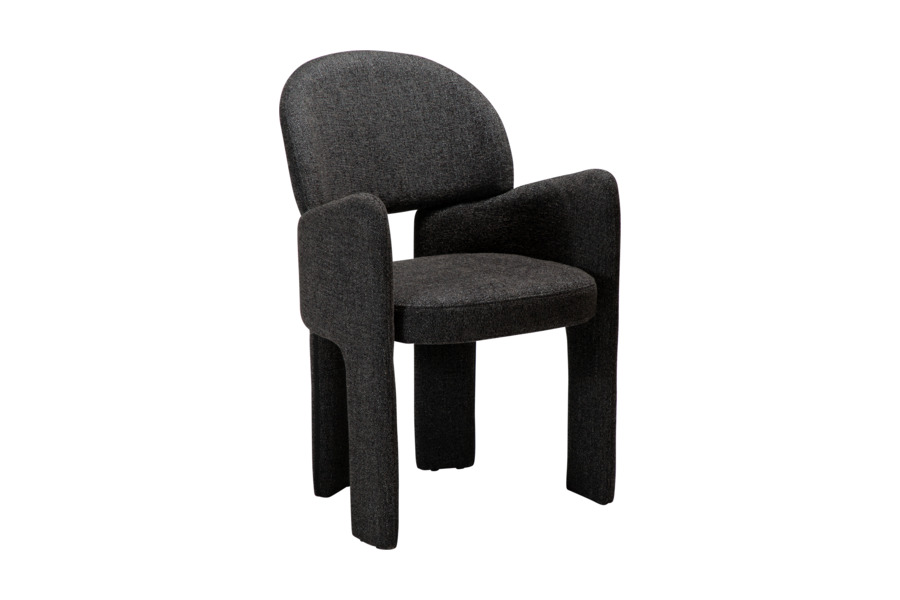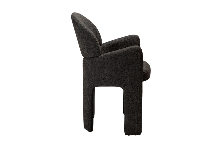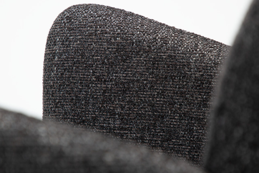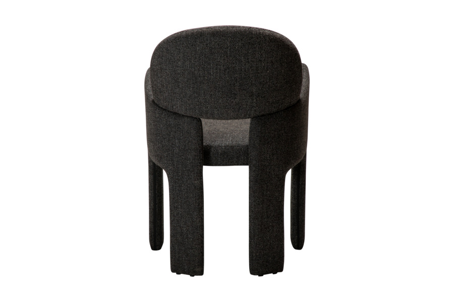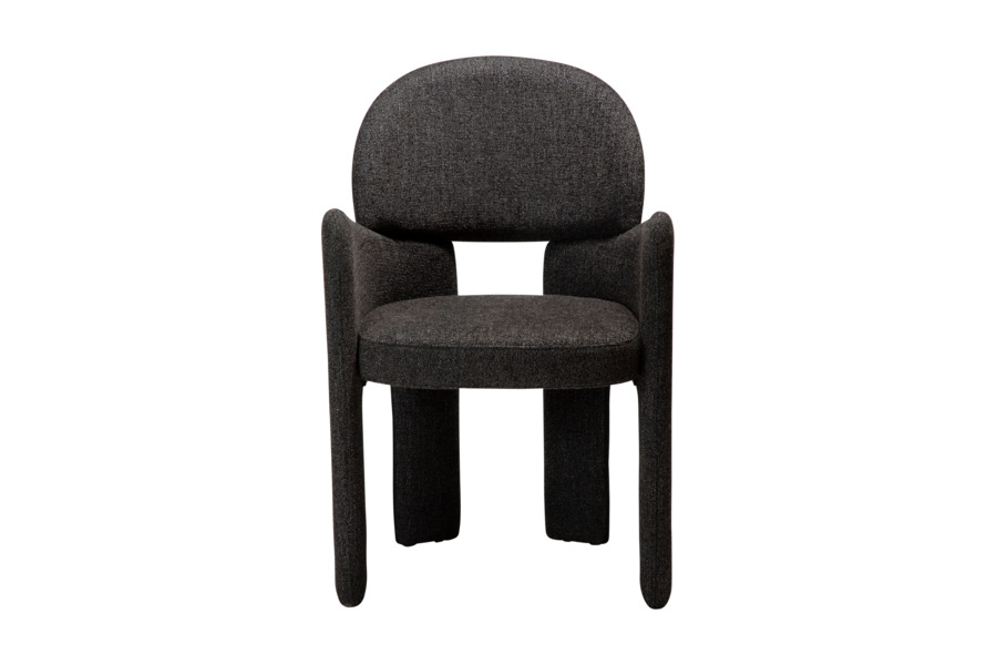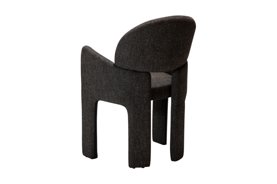 Ο γλυπτικός σχεδιασμός της χαρακτηρίζεται από απαλές καμπύλες και καθαρές γραμμές που προσφέρουν εργονομική στήριξη και άνετο κάθισμα. Η καρέκλα είναι πλήρως επενδυμένη με υφασμάτινη επένδυση υψηλής ποιότητας, η οποία καλύπτει ολόκληρη την κατασκευή από επάνω έως κάτω, δημιουργώντας μια ενιαία και εκλεπτυσμένη αισθητική.