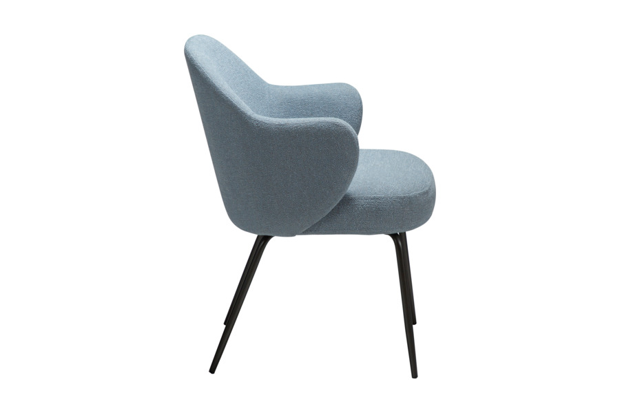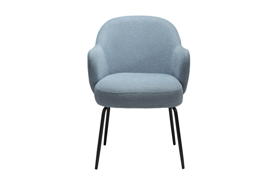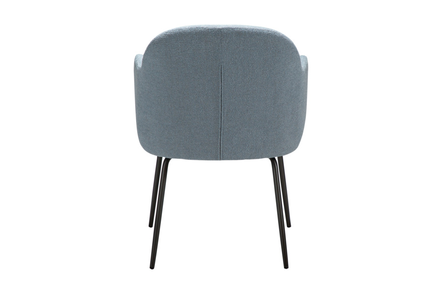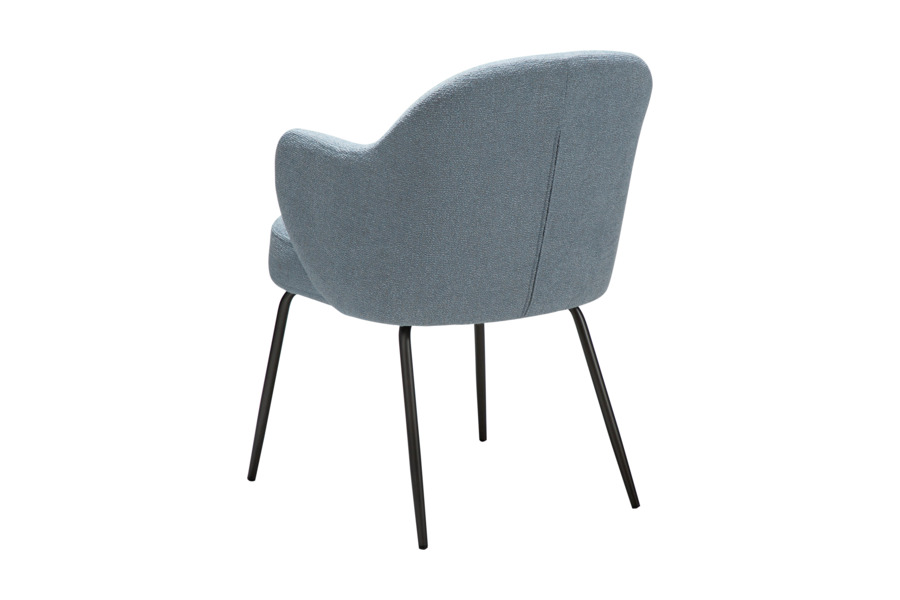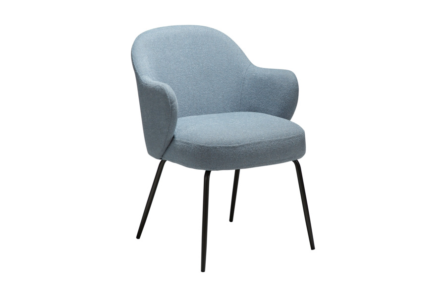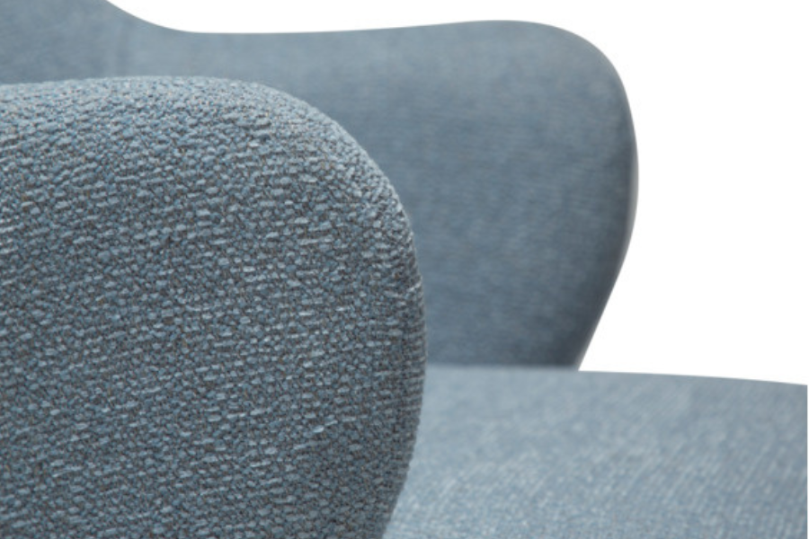 Η επένδυση από bouclé ύφασμα σε απόχρωση Blue Fog προσδίδει ιδιαίτερη αισθητική και υφή, δημιουργώντας μια κομψή και μοντέρνα εικόνα στον χώρο. Η απαλή υφή του υφάσματος προσφέρει ευχάριστη αίσθηση στο κάθισμα ενώ παράλληλα αναδεικνύει την ποιότητα του επίπλου.