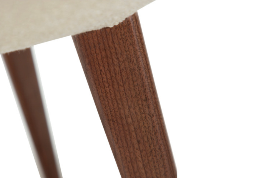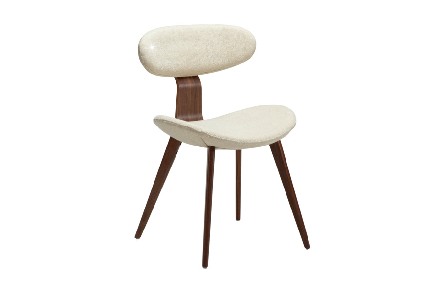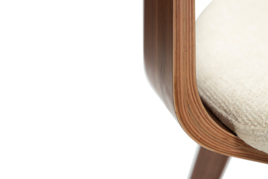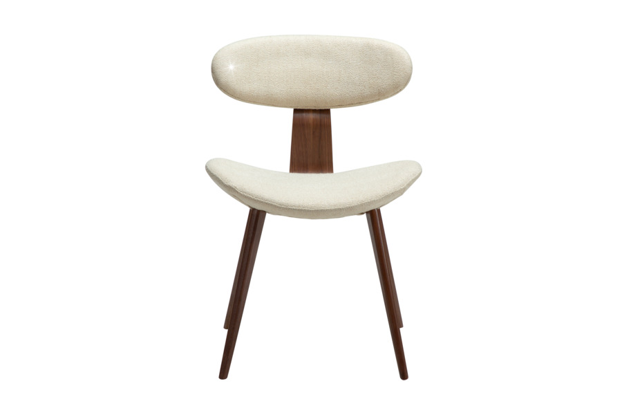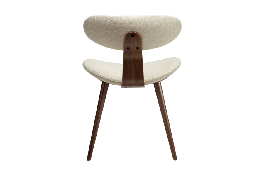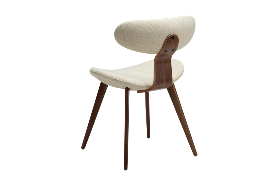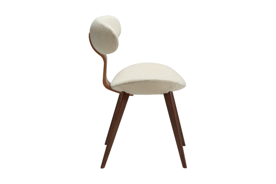Η καμπύλη μορφή της πλάτης και του καθίσματος δημιουργεί μια εργονομική και άνετη εμπειρία καθίσματος, ενώ τα πόδια από μασίφ ξύλο καρυδιάς προσθέτουν ζεστασιά και φυσική κομψότητα στον σχεδιασμό.