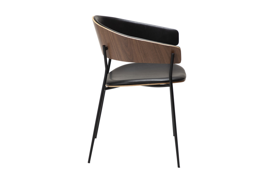 Ο σχεδιασμός της πλάτης αγκαλιάζει το σώμα και επεκτείνεται σε διακριτικά μπράτσα, προσφέροντας άνεση και εργονομική υποστήριξη. Το κάθισμα με μαλακή επένδυση ενισχύει την άνεση, καθιστώντας την ιδανική για καθημερινή χρήση σε τραπεζαρία ή επαγγελματικούς χώρους. Τα λεπτά μεταλλικά πόδια, ελαφρώς κωνικά, προσδίδουν σταθερότητα και μια ελαφριά, κομψή αισθητική.