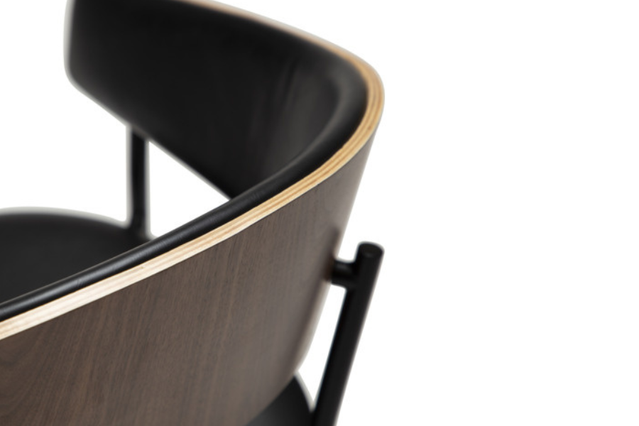Η καρέκλα τραπεζαρίας Crib Vintage Black Leather / Walnut Veneer, σχεδιασμένη από το studio Georgsen, αποτελεί έναν εκλεπτυσμένο συνδυασμό mid-century αισθητικής και σύγχρονου design. Η καμπυλωτή πλάτη από καπλαμά καρυδιάς δημιουργεί μια ζεστή και φυσική αίσθηση, ενώ η εσωτερική επένδυση από vintage black δέρμα προσθέτει κομψότητα και διαχρονικό χαρακτήρα.