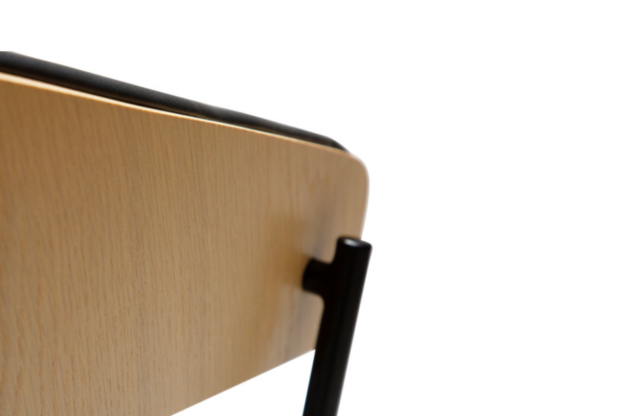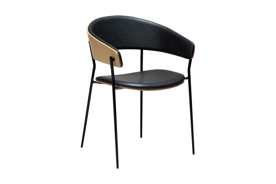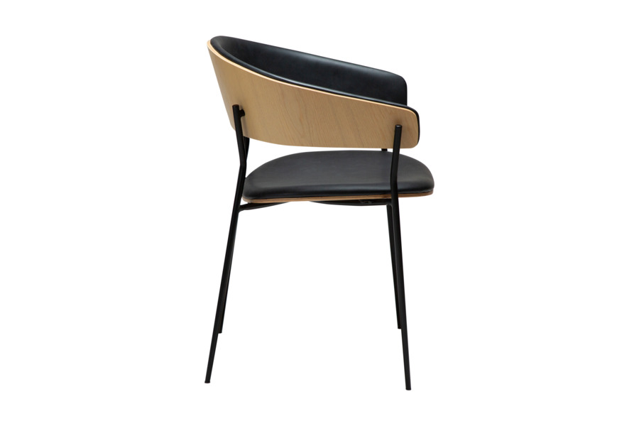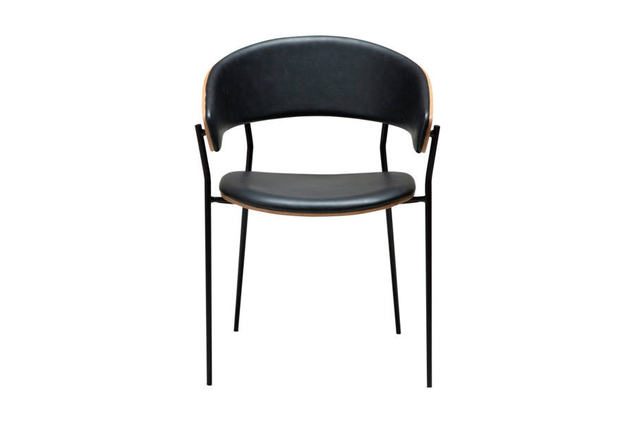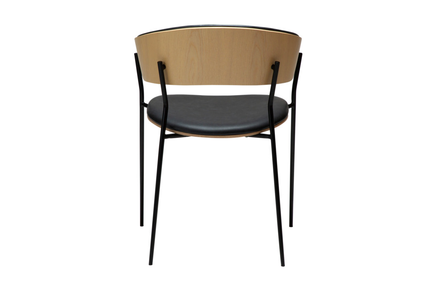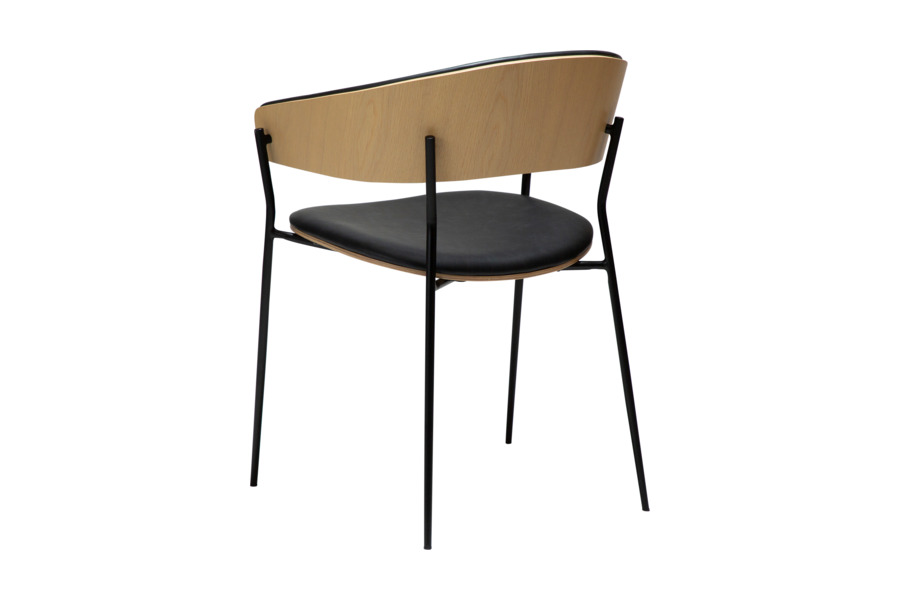 Ο σχεδιασμός της πλάτης αγκαλιάζει το σώμα και εξελίσσεται σε διακριτικά μπράτσα, προσφέροντας εργονομική υποστήριξη και άνεση. Το κάθισμα με μαλακή επένδυση ενισχύει την καθημερινή λειτουργικότητα, ενώ τα λεπτά μεταλλικά πόδια σε ελαφρώς κωνική μορφή προσδίδουν σταθερότητα και μια ανάλαφρη, μοντέρνα εμφάνιση.