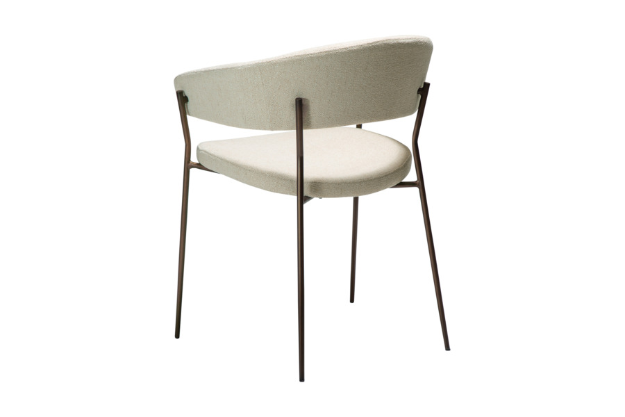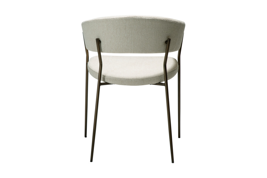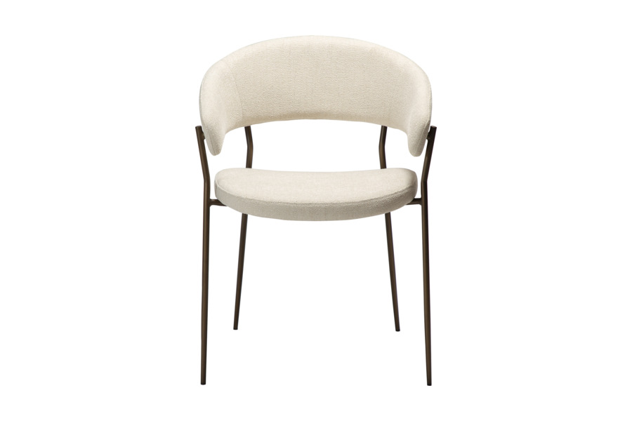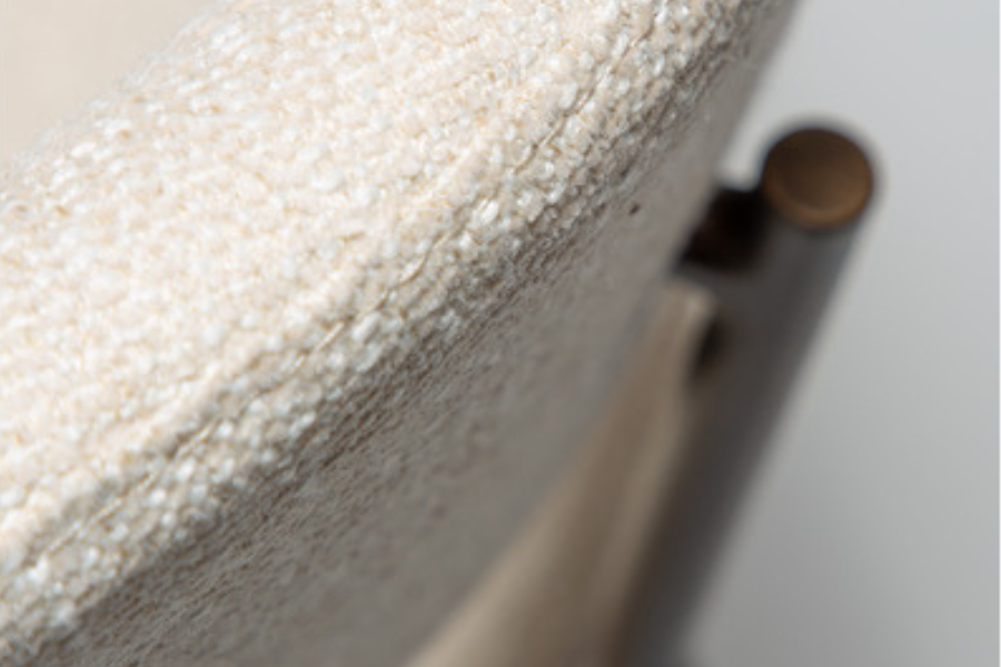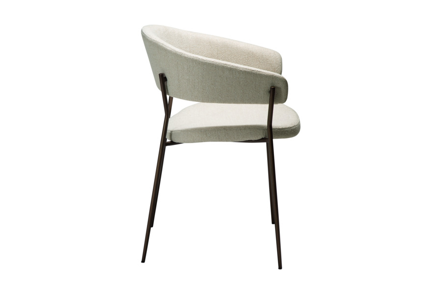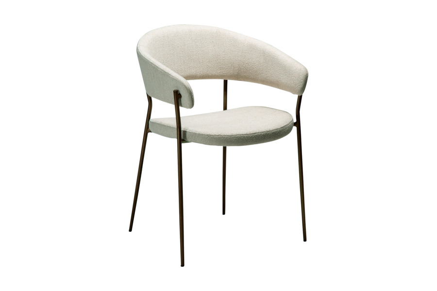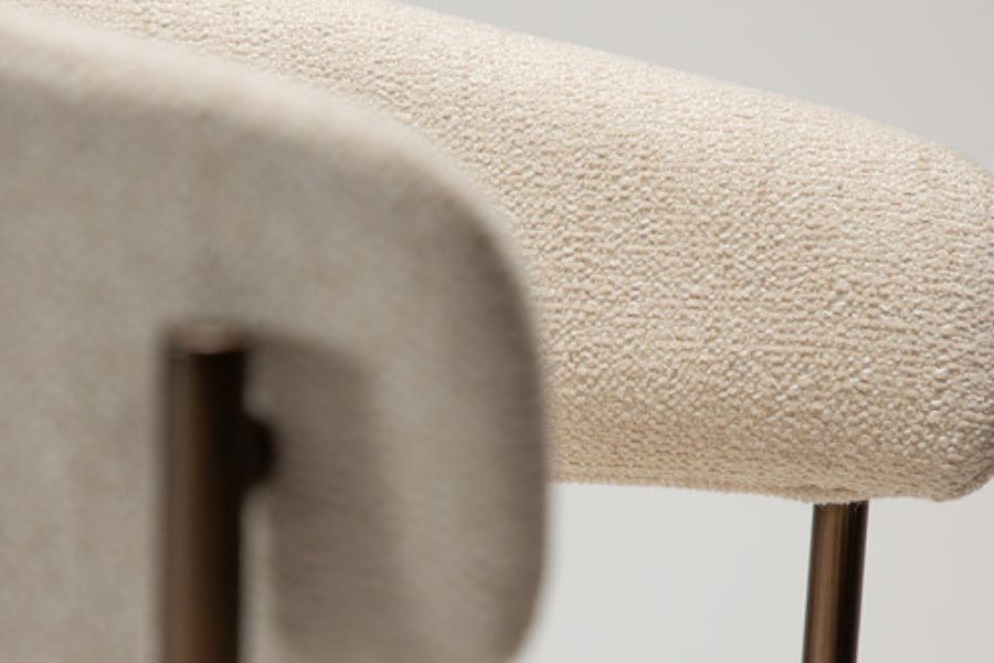 Η επένδυση από ύφασμα boucle σε απόχρωση beige προσδίδει φωτεινότητα και κομψότητα στον χώρο, ενώ η απαλή υφή ενισχύει την αίσθηση πολυτέλειας. Το εργονομικό κάθισμα ακολουθεί τις φυσικές γραμμές του σώματος, καθιστώντας την καρέκλα ιδανική τόσο για καθημερινή χρήση όσο και για πιο formal περιστάσεις.