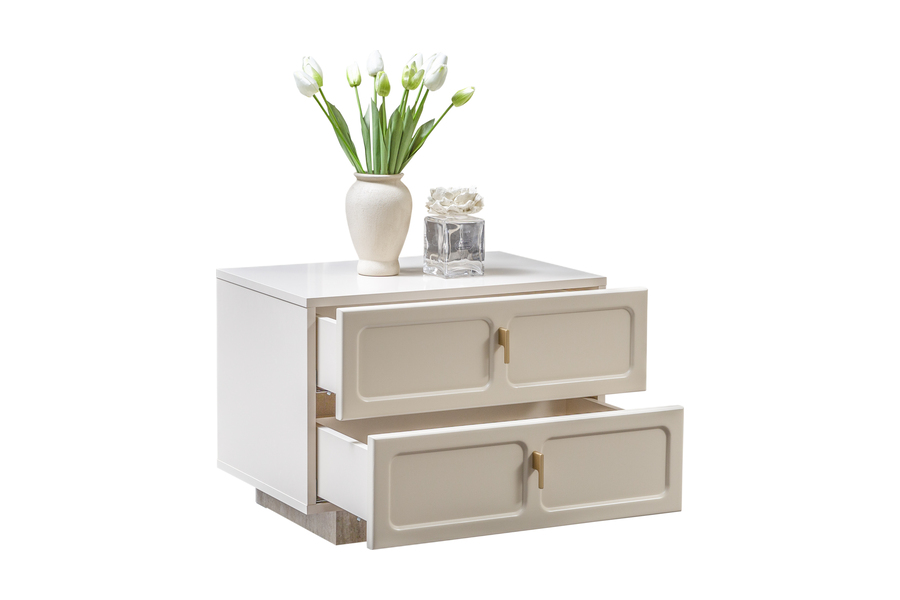 Διαθέτει δύο ευρύχωρα συρτάρια που προσφέρουν πρακτικό αποθηκευτικό χώρο για προσωπικά αντικείμενα, βιβλία ή μικρά αντικείμενα καθημερινής χρήσης. Οι διακριτικές μεταλλικές λαβές προσθέτουν μια μοντέρνα πινελιά που ολοκληρώνει την κομψή του εμφάνιση.