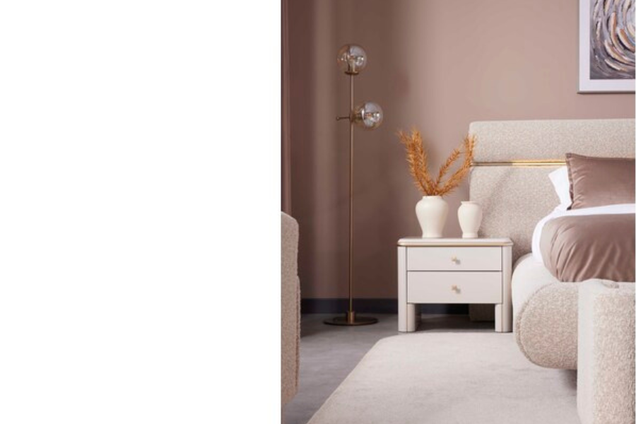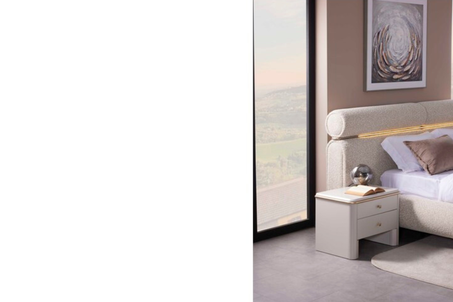 Το κομοδίνο Pier συνδυάζεται ιδανικά με το ντυμένο κρεβάτι Pier και τα υπόλοιπα έπιπλα της σειράς, δημιουργώντας μια ολοκληρωμένη και αρμονική κρεβατοκάμαρα.