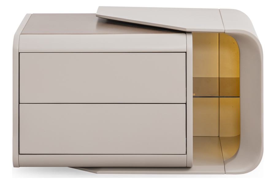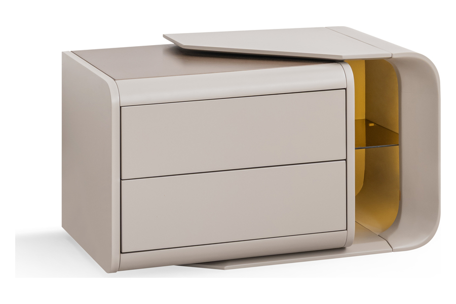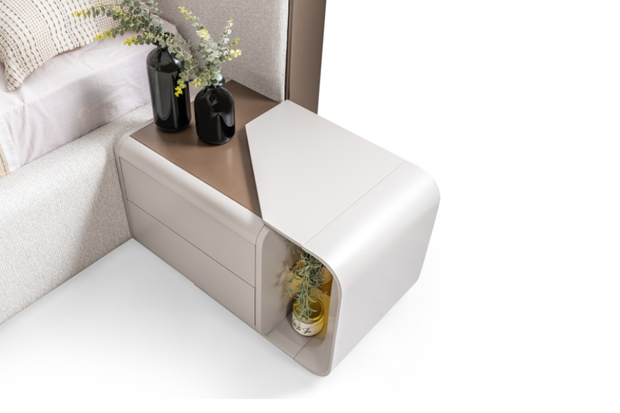 Η επάνω επιφάνεια είναι ιδανική για φωτιστικά, βιβλία ή διακοσμητικά στοιχεία, δημιουργώντας ένα πρακτικό και αισθητικά ισορροπημένο σημείο δίπλα στο κρεβάτι.