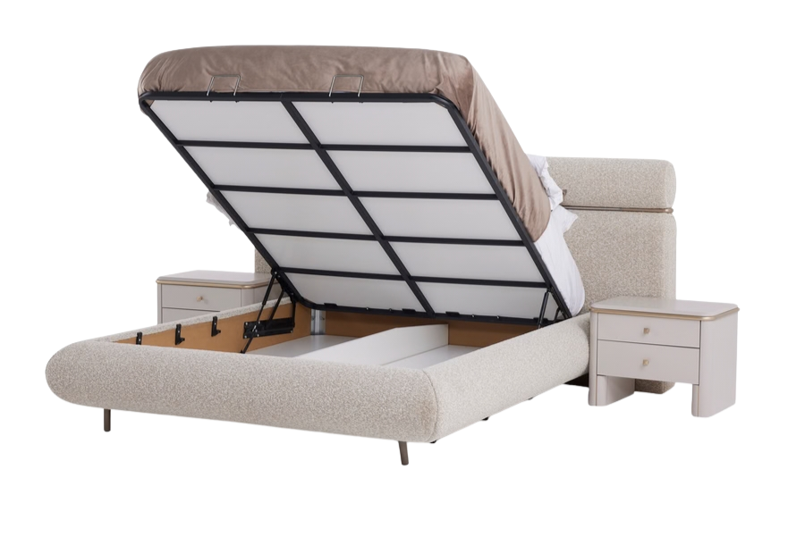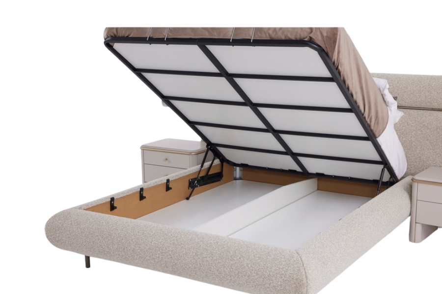 Το κρεβάτι διαθέτει ευρύχωρο αποθηκευτικό χώρο κάτω από το στρώμα, ο οποίος ανοίγει εύκολα μέσω μηχανισμού ανύψωσης με αμορτισέρ, προσφέροντας πρακτική λύση αποθήκευσης για κλινοσκεπάσματα, κουβέρτες και άλλα αντικείμενα.