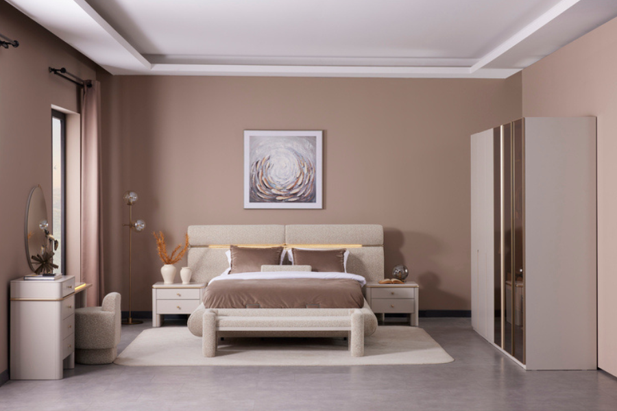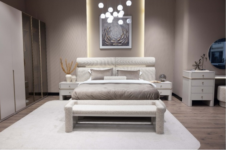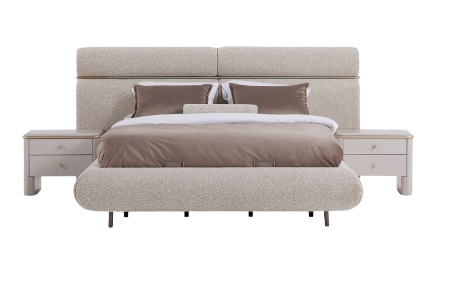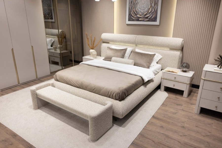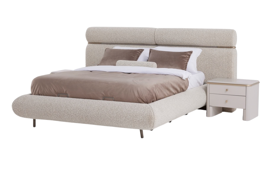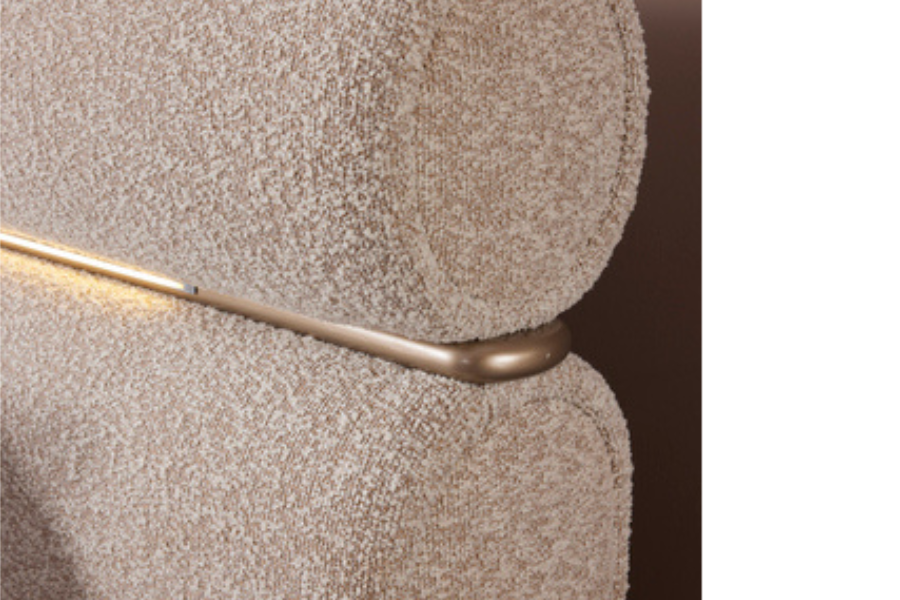 Ο ιδιαίτερος σχεδιασμός του κεφαλαριού με τις απαλές καμπύλες γραμμές και τον ενσωματωμένο φωτισμό δημιουργεί μια ζεστή και χαλαρωτική ατμόσφαιρα στον χώρο του υπνοδωματίου. Η υφασμάτινη επένδυση προσφέρει πολυτελή αίσθηση και άνεση, ενώ τα προσεγμένα τελειώματα αναδεικνύουν τον μοντέρνο χαρακτήρα του κρεβατιού.