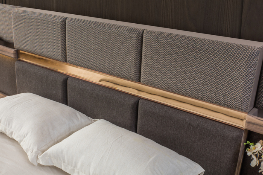 Το κεφαλάρι διαθέτει διακριτικές οριζόντιες γραμμές και ενσωματωμένο ράφι, προσφέροντας πρακτικότητα για την τοποθέτηση διακοσμητικών αντικειμένων ή προσωπικών αντικειμένων καθημερινής χρήσης. Ο ενσωματωμένος φωτισμός LED προσθέτει ατμόσφαιρα και λειτουργικότητα, δημιουργώντας έναν χαλαρωτικό φωτισμό ιδανικό για το υπνοδωμάτιο.