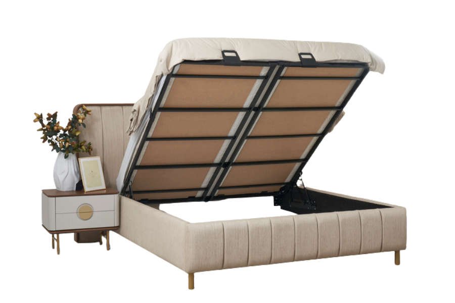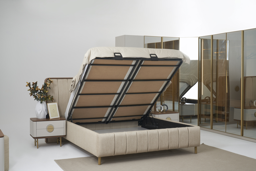 Το κρεβάτι διαθέτει πρακτικό αποθηκευτικό χώρο με ανυψωτικό μηχανισμό, ιδανικό για την αποθήκευση λευκών ειδών και άλλων αντικειμένων, διατηρώντας τον χώρο οργανωμένο.