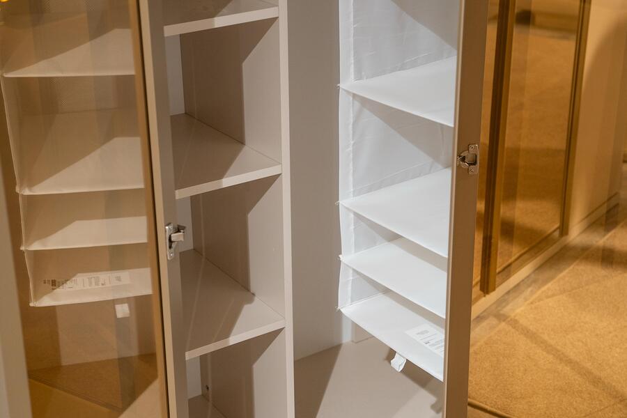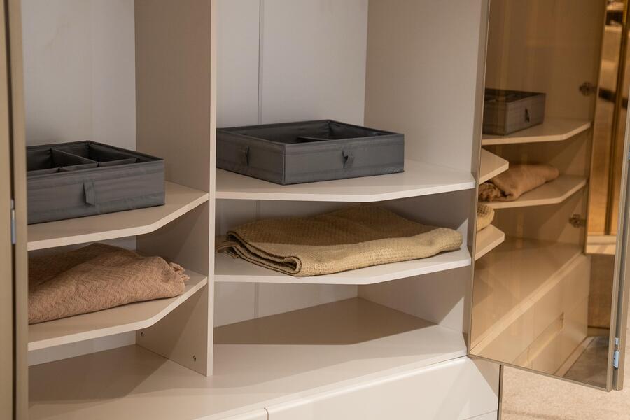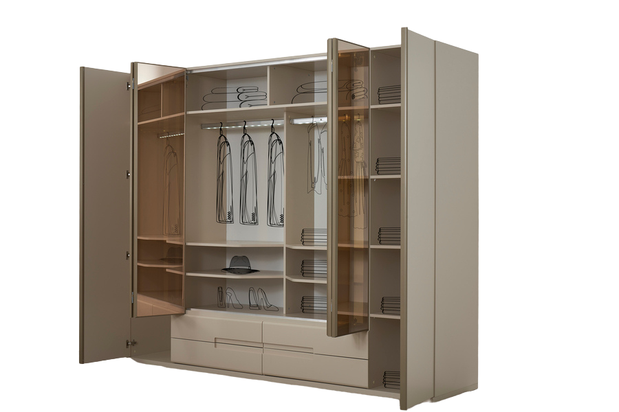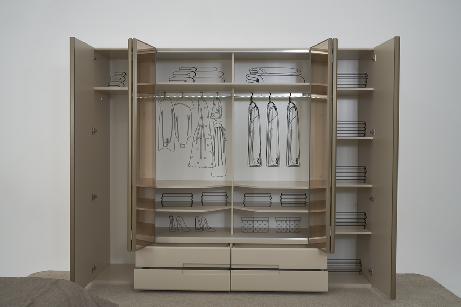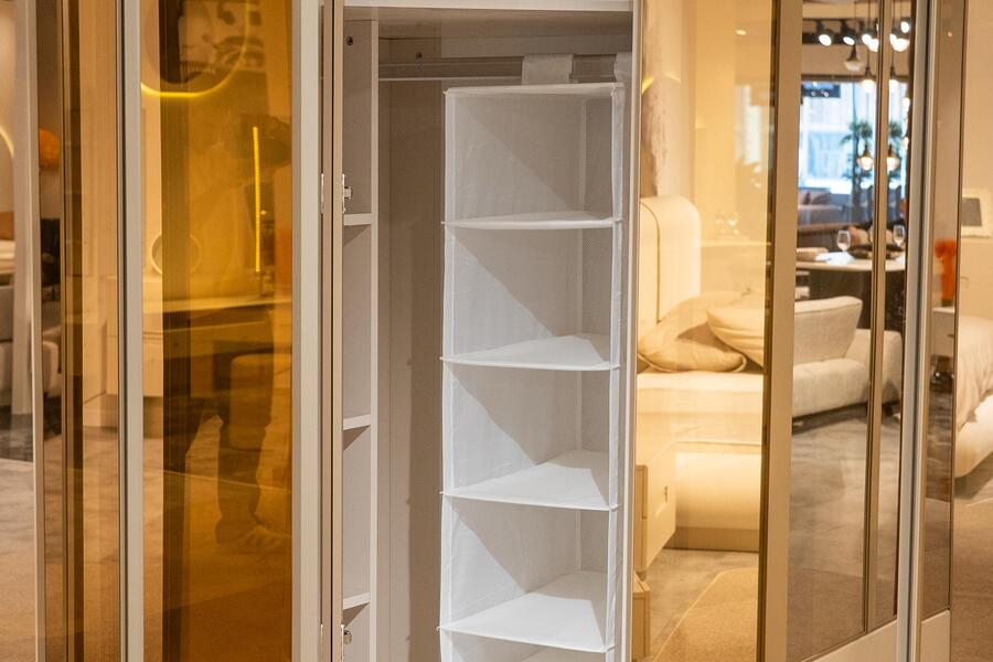 Το εσωτερικό της είναι σχεδιασμένο για πρακτική οργάνωση, με συνδυασμό από ράφια, κρεμάστρες και αποθηκευτικούς χώρους που επιτρέπουν την εύκολη ταξινόμηση ρούχων και αξεσουάρ. Οι ευρύχωρες διαστάσεις της την καθιστούν ιδανική για καθημερινή χρήση, καλύπτοντας τις ανάγκες ενός ολοκληρωμένου υπνοδωματίου.