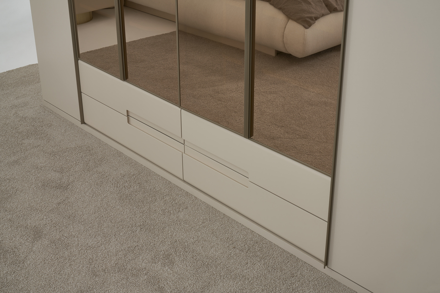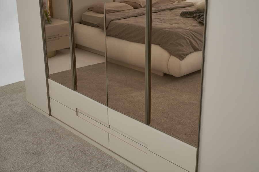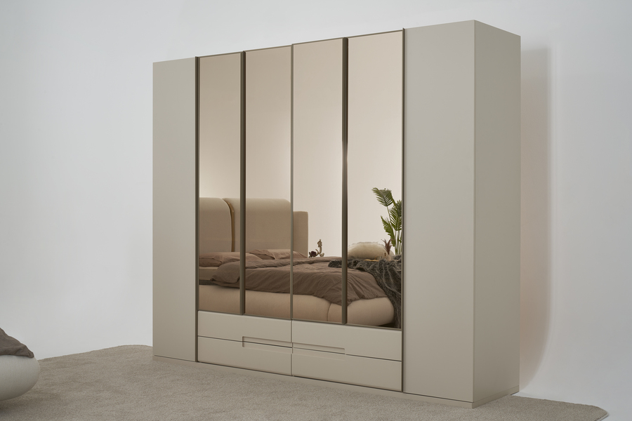Οι πόρτες της ντουλάπας διαθέτουν σύγχρονο σχεδιασμό με μεγάλες επιφάνειες που ενισχύουν τη φωτεινότητα του χώρου, ενώ η στιβαρή κατασκευή εξασφαλίζει ανθεκτικότητα και μακροχρόνια χρήση.
