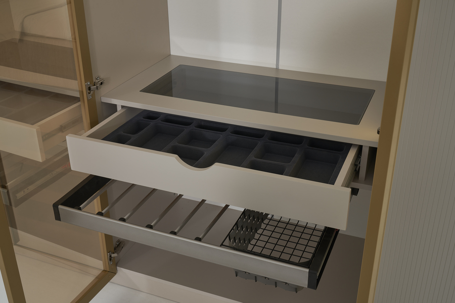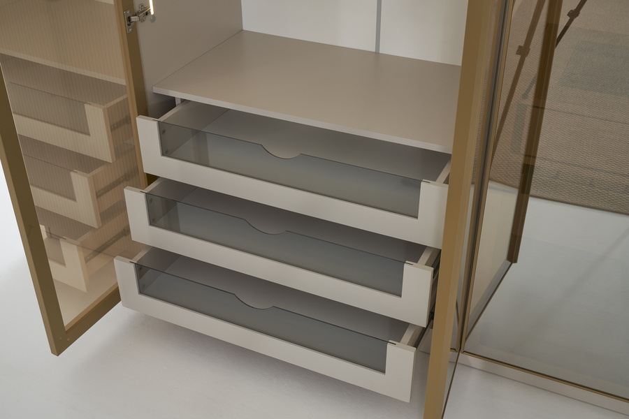 Το εσωτερικό της είναι οργανωμένο με ράφια, κρεμάστρες και συρτάρια, προσφέροντας άνετο και ευέλικτο αποθηκευτικό χώρο για ρούχα, αξεσουάρ και προσωπικά αντικείμενα.
