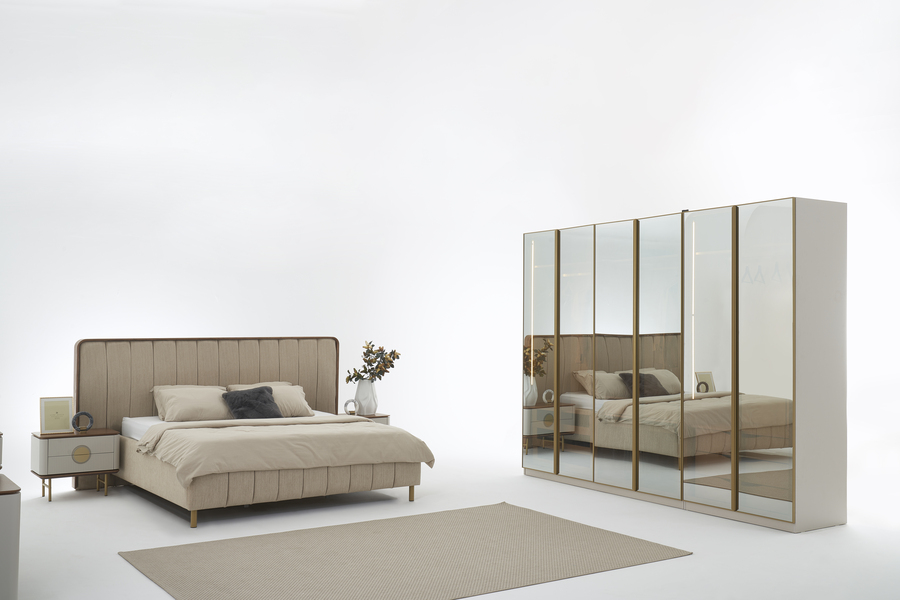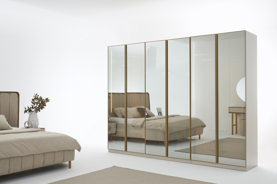 Η ντουλάπα Viola 3 μέτρων αποτελεί μια κομψή και πρακτική λύση για σύγχρονα υπνοδωμάτια, συνδυάζοντας υψηλή αισθητική με μεγάλη αποθηκευτική δυνατότητα. Ο σχεδιασμός της με καθαρές γραμμές και γυάλινες επιφάνειες με μεταλλικά πλαίσια προσδίδει μια αίσθηση πολυτέλειας στον χώρο.