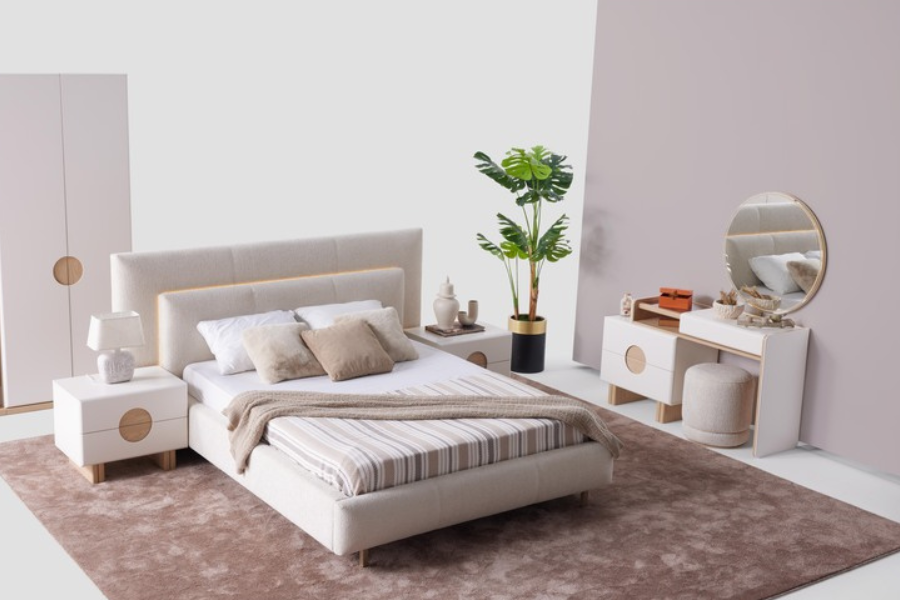 Ο σχεδιασμός της σειράς χαρακτηρίζεται από καθαρές γραμμές, minimal λεπτομέρειες και κομψούς χρωματικούς συνδυασμούς που προσδίδουν ζεστασιά και σύγχρονο χαρακτήρα στο υπνοδωμάτιο. Το ντυμένο κρεβάτι με επενδυμένο κεφαλάρι δημιουργεί μια αίσθηση άνεσης και πολυτέλειας, ενώ τα κομοδίνα και η συρταριέρα προσφέρουν πρακτικούς αποθηκευτικούς χώρους για την καθημερινή οργάνωση του χώρου.