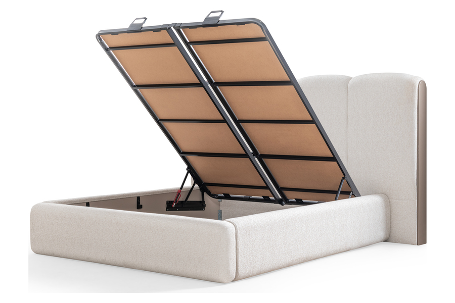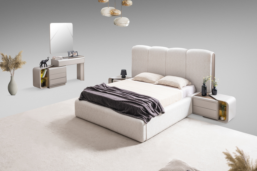 Το ντυμένο κρεβάτι αποτελεί το κεντρικό στοιχείο του σετ, με ψηλό υφασμάτινο κεφαλάρι που προσφέρει άνεση και κομψότητα στον χώρο. Η βάση του διαθέτει πρακτικό αποθηκευτικό χώρο κάτω από το στρώμα, ιδανικό για την αποθήκευση κλινοσκεπασμάτων και αντικειμένων, διατηρώντας το υπνοδωμάτιο οργανωμένο και λειτουργικό.