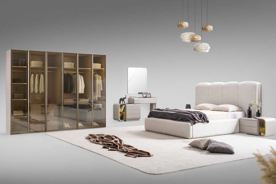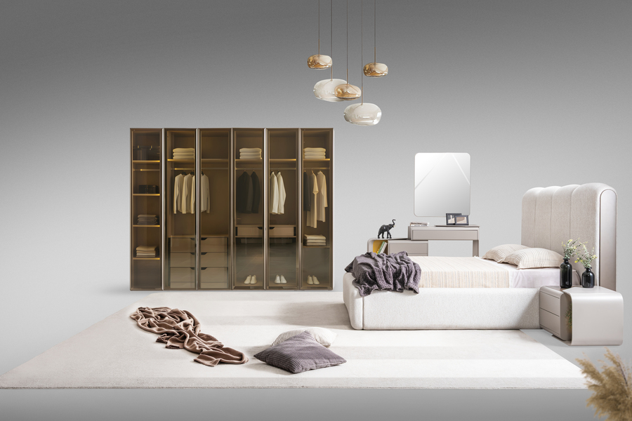 Η ντουλάπα του σετ ξεχωρίζει για τον σύγχρονο σχεδιασμό της με μεγάλες γυάλινες επιφάνειες και οργανωμένο εσωτερικό χώρο. Προσφέρει άνετη αποθήκευση για ρούχα και αξεσουάρ, συμβάλλοντας στη δημιουργία ενός τακτοποιημένου και λειτουργικού υπνοδωματίου.