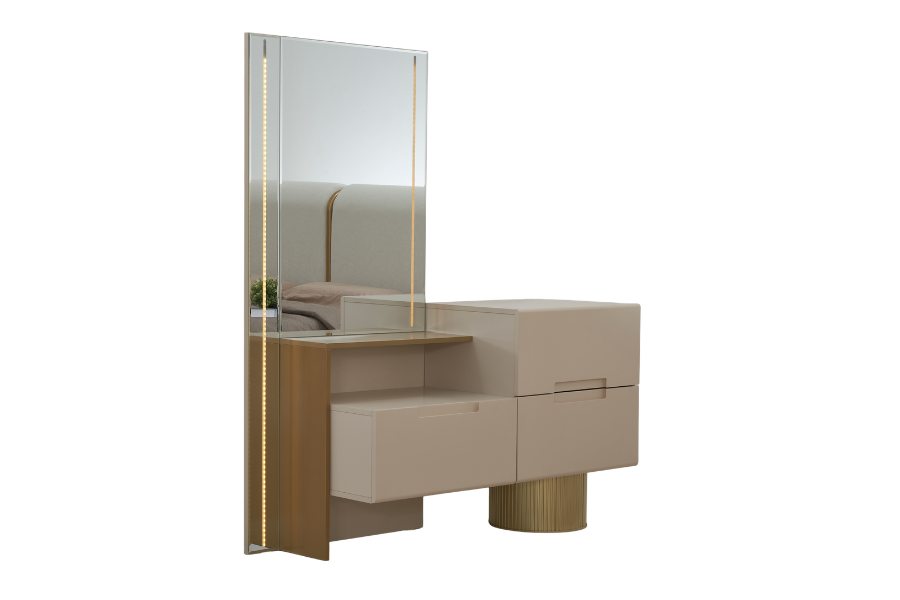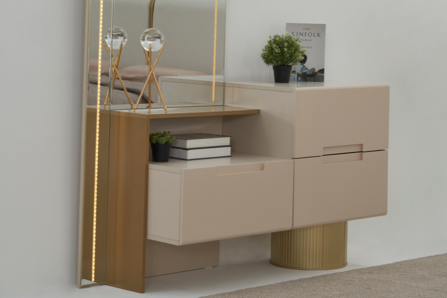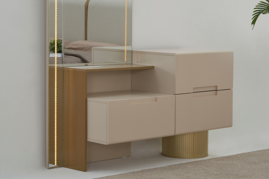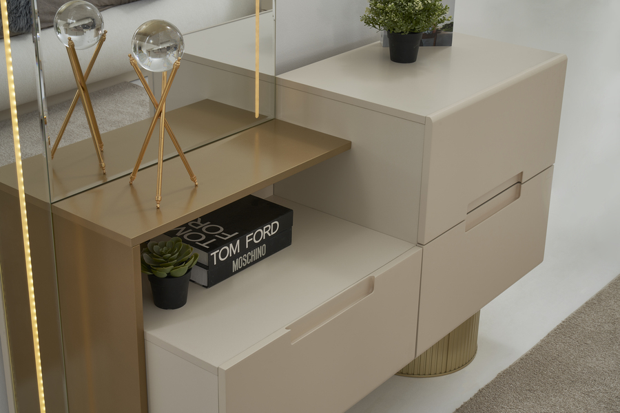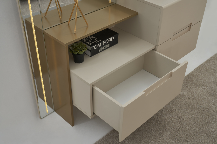 Διαθέτει ευρύχωρα συρτάρια που προσφέρουν πρακτικό αποθηκευτικό χώρο για ρούχα, αξεσουάρ και προσωπικά αντικείμενα, συμβάλλοντας στην καλύτερη οργάνωση του υπνοδωματίου. Η επιφάνειά της μπορεί να χρησιμοποιηθεί για διακοσμητικά αντικείμενα ή καθημερινά απαραίτητα, δημιουργώντας ένα λειτουργικό σημείο μέσα στον χώρο.