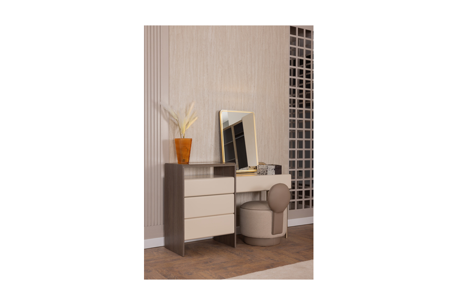 Διαθέτει ευρύχωρα συρτάρια που προσφέρουν άνετο αποθηκευτικό χώρο για προσωπικά αντικείμενα, αξεσουάρ και καθημερινά είδη. Η επιφάνειά της είναι ιδανική για την τοποθέτηση καθρέφτη, διακοσμητικών αντικειμένων ή προϊόντων καλλωπισμού.