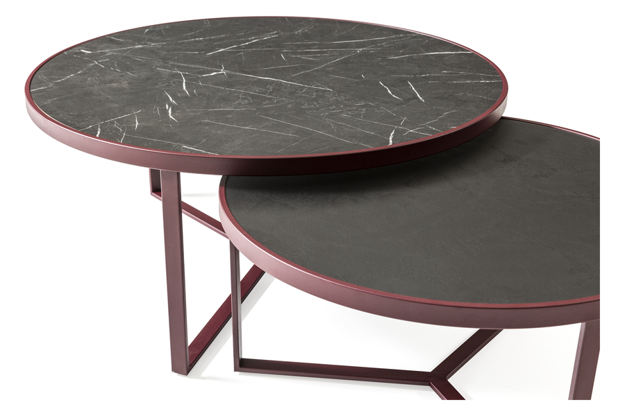 Η μεταλλική βάση σε απόχρωση Red Metal προσθέτει ένταση και ζωντάνια στο design, δημιουργώντας ένα statement κομμάτι για το σαλόνι σας. Ο έξυπνος σχεδιασμός του σετ επιτρέπει το ένα τραπέζι να τοποθετείται κάτω από το άλλο, εξοικονομώντας χώρο και προσφέροντας λειτουργικότητα.