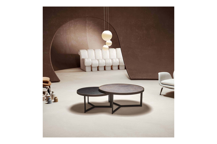 Η μεταλλική βάση σε μαύρο φινίρισμα προσθέτει βιομηχανικό χαρακτήρα, ενώ η δυνατότητα τοποθέτησης του ενός τραπεζιού κάτω από το άλλο κάνει το σετ εξαιρετικά ευέλικτο και ιδανικό για κάθε σύγχρονο σαλόνι.