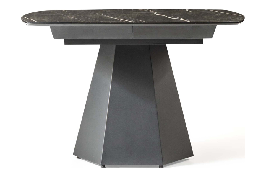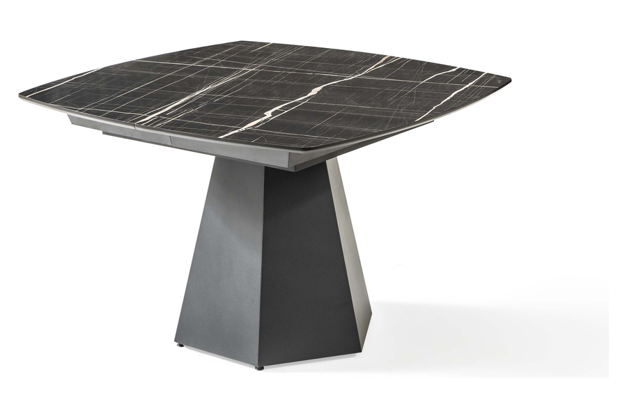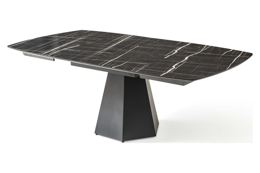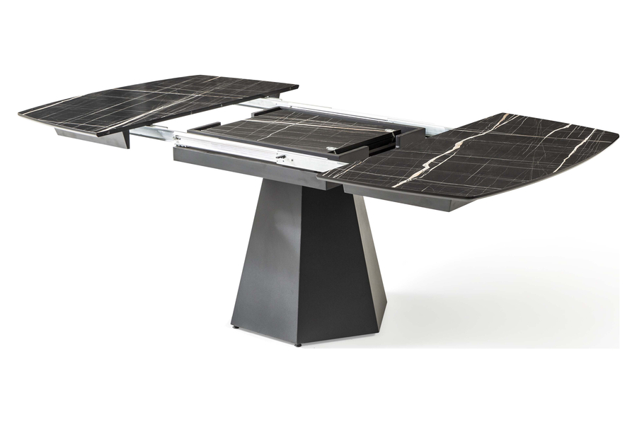 Η στιβαρή γεωμετρική μεταλλική βάση σε σχήμα πυραμίδας προσδίδει αρχιτεκτονική αισθητική και σταθερότητα, μετατρέποντας το τραπέζι σε εντυπωσιακό κεντρικό στοιχείο κάθε τραπεζαρίας. Ο μηχανισμός προέκτασης επιτρέπει την εύκολη επέκταση της επιφάνειας, καθιστώντας το ιδανικό για μεγάλες παρέες ή γιορτινά τραπέζια.