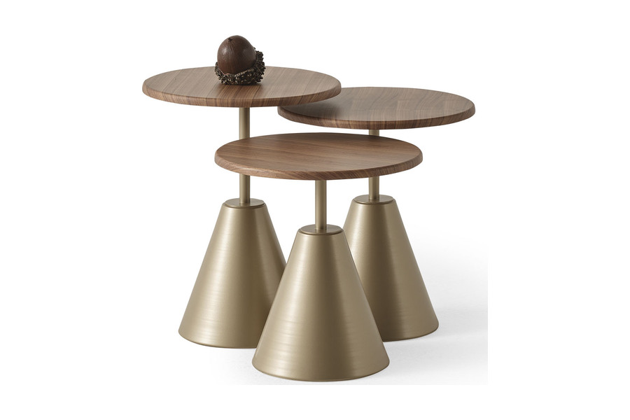 Οι στρογγυλές επιφάνειες σε απόχρωση καρυδιάς (walnut) προσφέρουν ζεστασιά και διαχρονικό χαρακτήρα, ενώ οι μεταλλικές βάσεις σε κομψό χρυσό τόνο προσθέτουν πολυτέλεια και σταθερότητα.