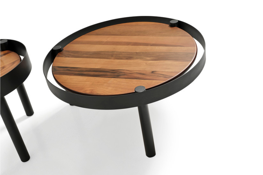 Η στρογγυλή ξύλινη επιφάνεια με φυσικά νερά συνδυάζεται αρμονικά με τον μαύρο μεταλλικό σκελετό, δημιουργώντας έντονη αισθητική αντίθεση και μοντέρνο χαρακτήρα.