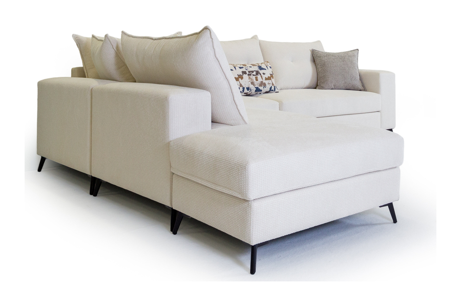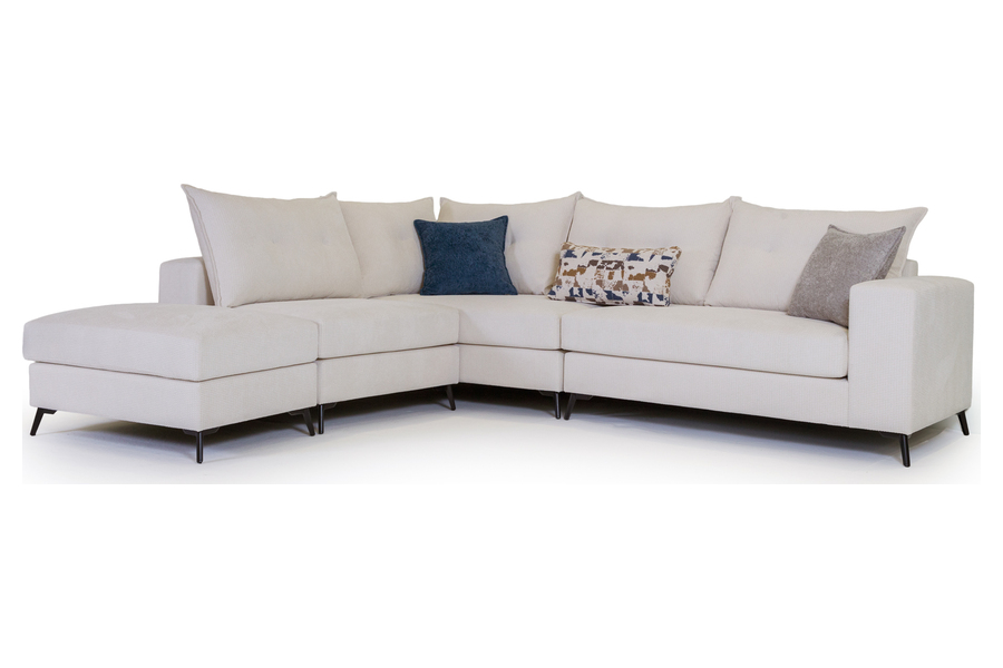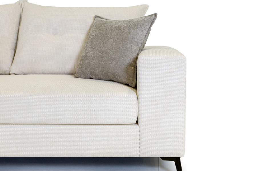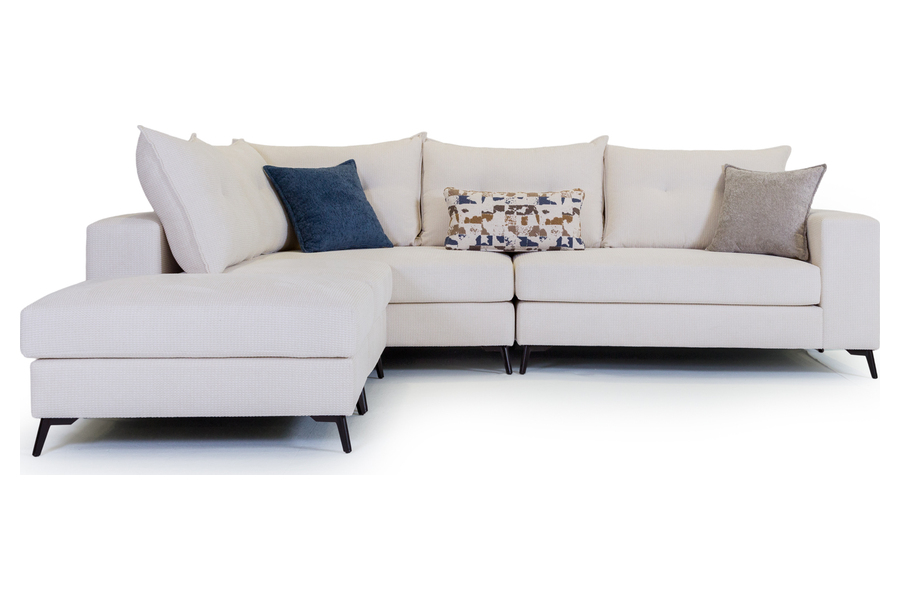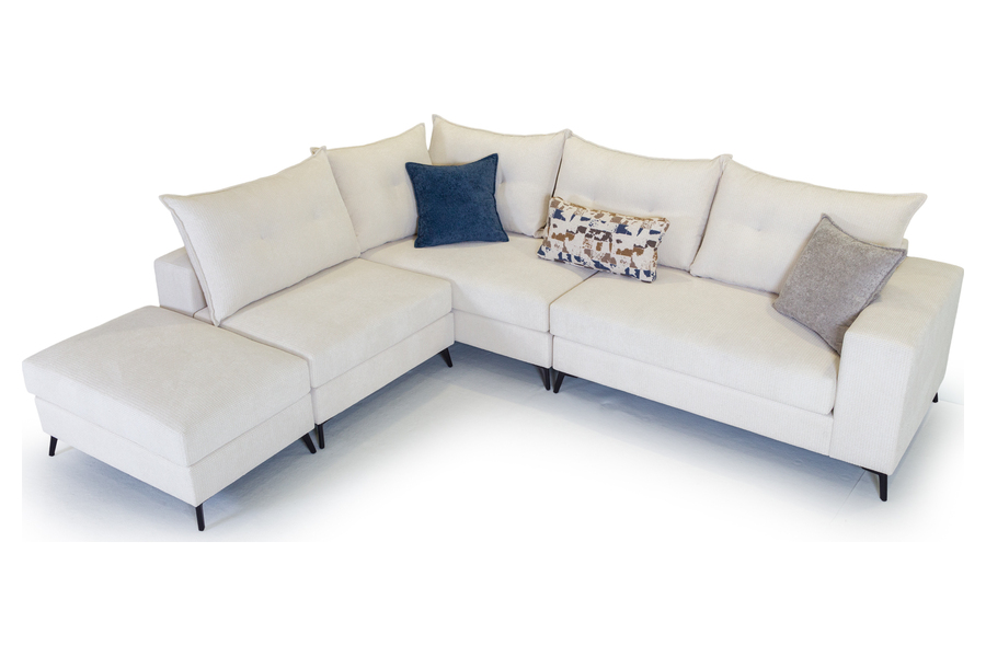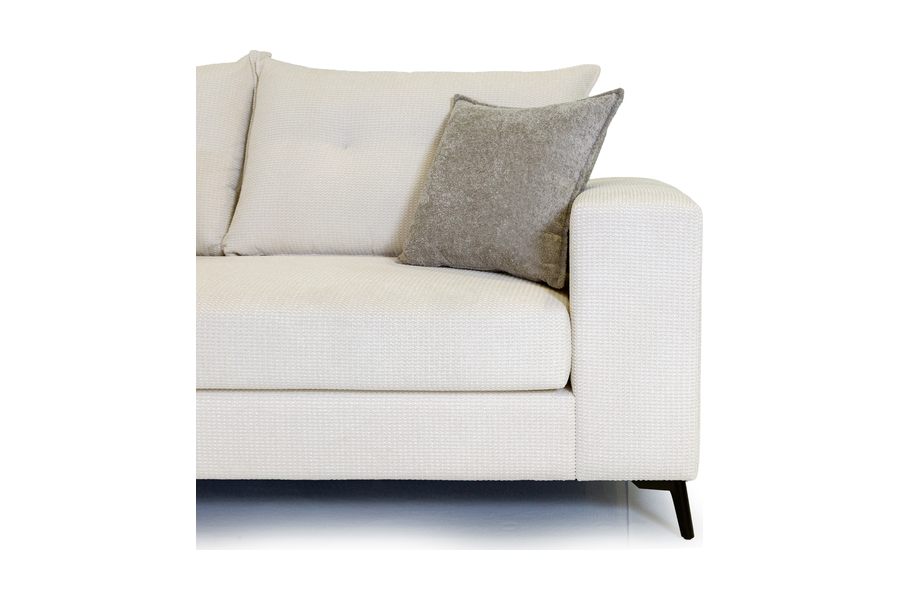 Τα μεγάλα και αναπαυτικά καθίσματα σε συνδυασμό με τα αφράτα μαξιλάρια πλάτης δημιουργούν ιδανικές συνθήκες χαλάρωσης, ενώ η γωνιακή του διάταξη αξιοποιεί άψογα τον χώρο του σαλονιού. Τα λεπτά μεταλλικά πόδια προσθέτουν μοντέρνο χαρακτήρα και αίσθηση ελαφρότητας στο σύνολο.