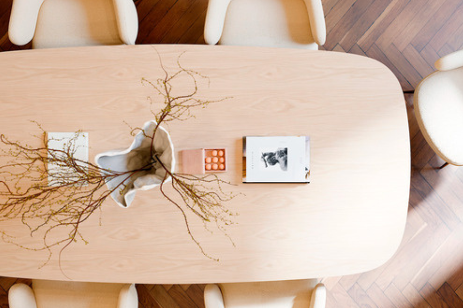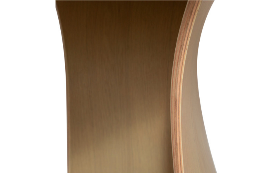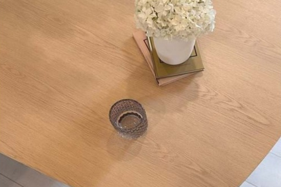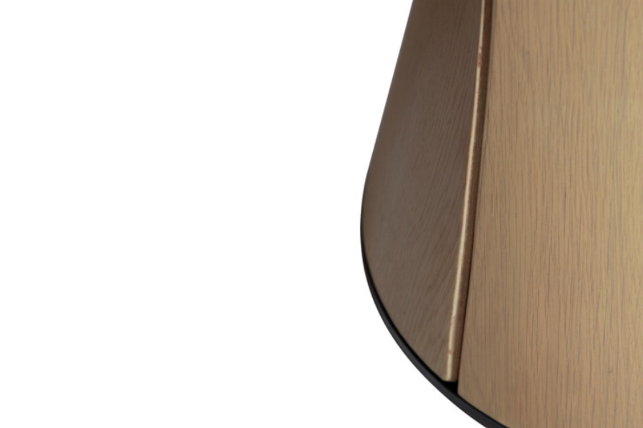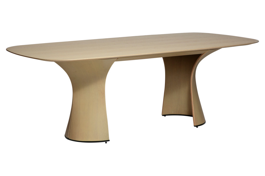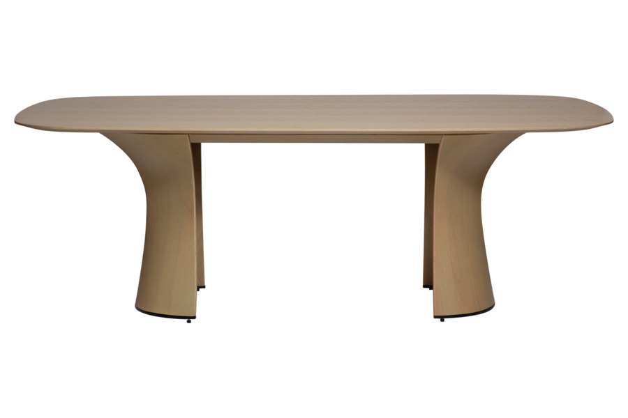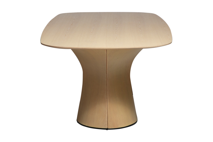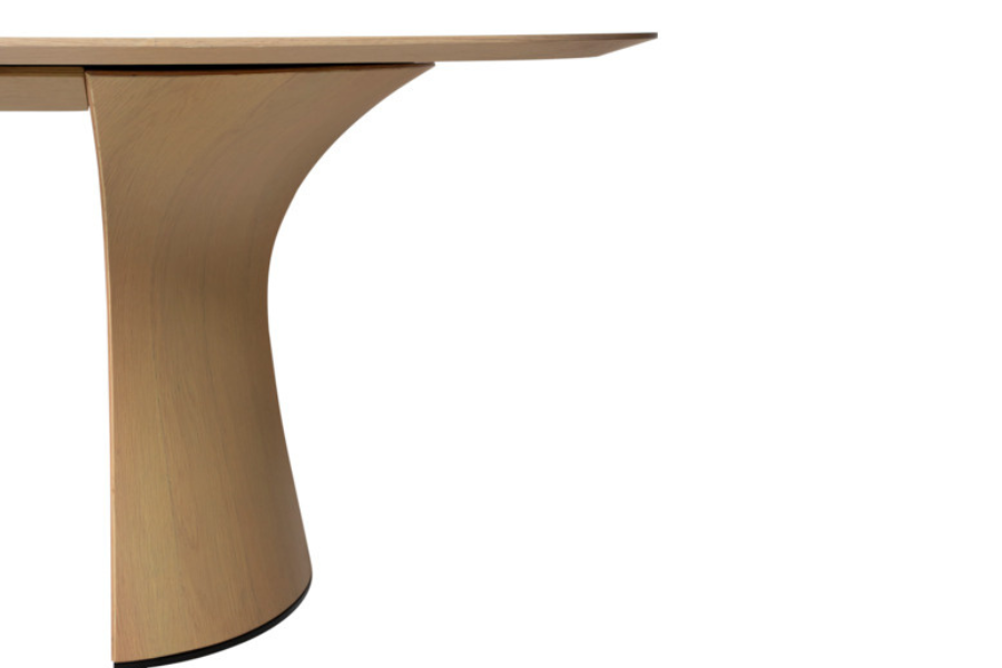 Η επιφάνεια από καπλαμά δρυός (oak veneer) σε ανοιχτή whitewashed απόχρωση αναδεικνύει τη φυσική υφή του ξύλου, προσδίδοντας φωτεινότητα και ζεστασιά στο περιβάλλον. Οι απαλά καμπυλωμένες άκρες ενισχύουν την αίσθηση ροής και κάνουν το τραπέζι πιο φιλόξενο και λειτουργικό.