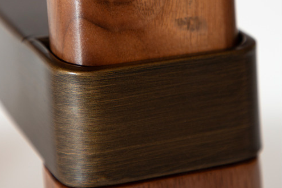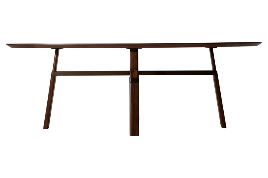 Η επιφάνεια με λοξή ακμή (bevelled edge) δημιουργεί μια αίσθηση ελαφρότητας, ενώ η βάση με τα χαρακτηριστικά διασταυρωμένα πόδια αναδεικνύει την υψηλή ποιότητα κατασκευής και τη λεπτομέρεια στις ενώσεις. Η στιβαρή δομή εξασφαλίζει σταθερότητα, ενώ η συνολική μορφή παραμένει κομψή και ισορροπημένη.